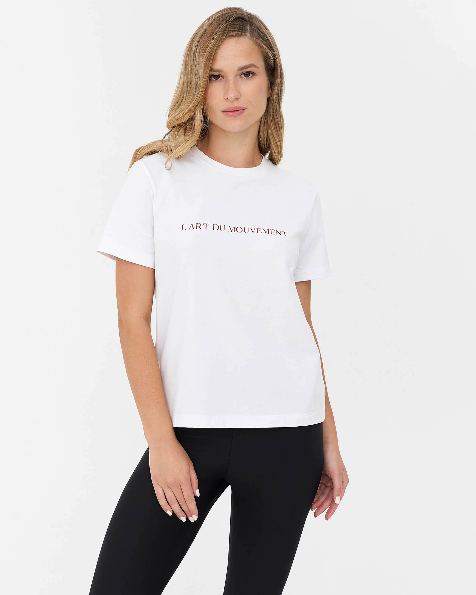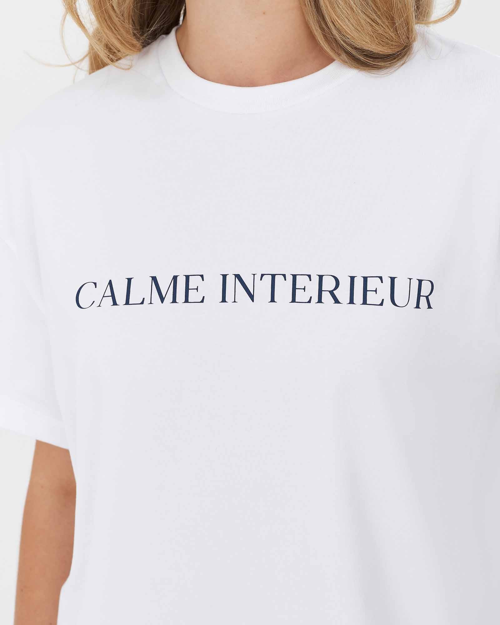 Однотонна футболка вільного крою з круглою горловиною та написом "Calme Interieur" спереду. Модель з короткими рукавами та опущеними плечовими...