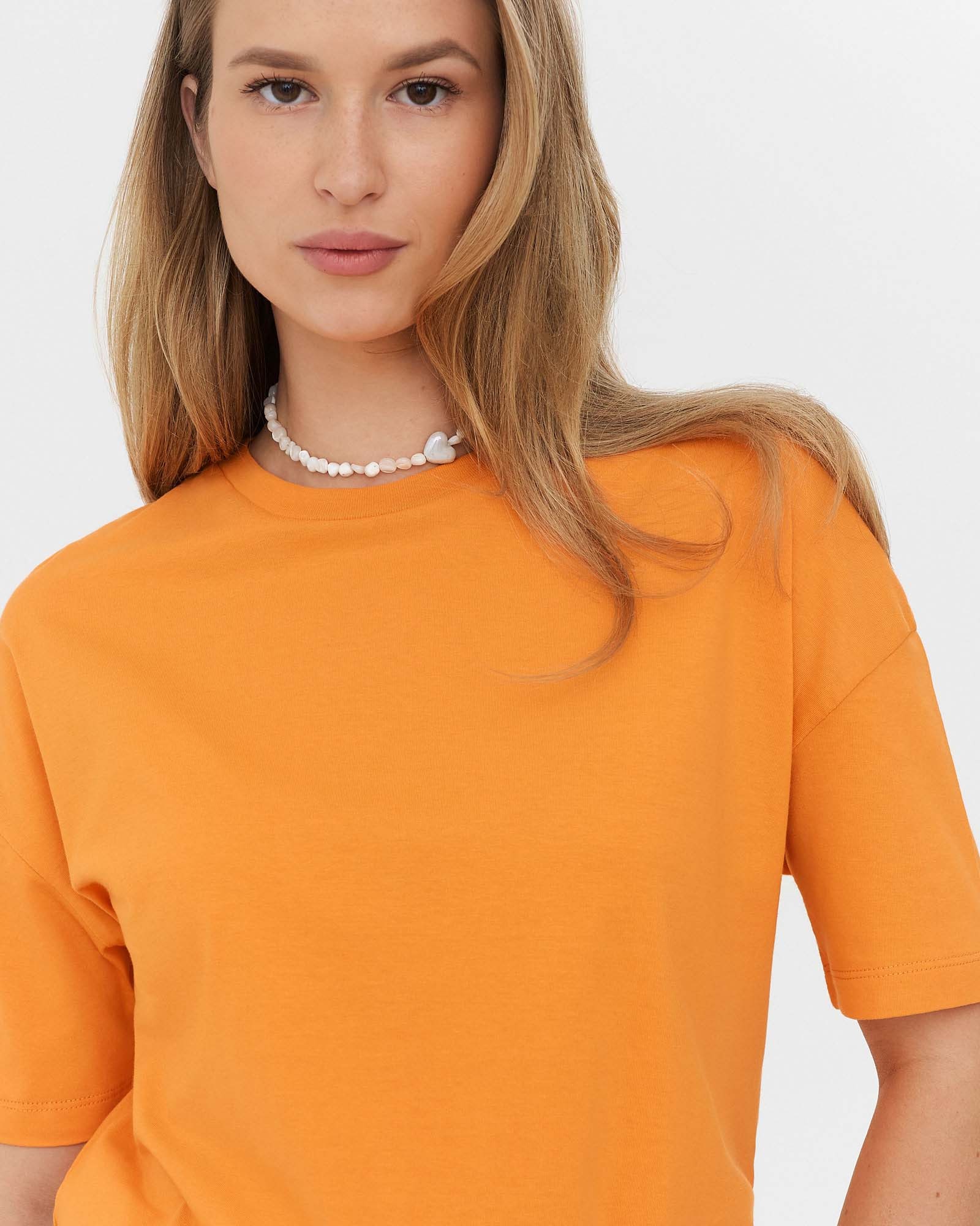 Однотонна футболка вільного крою з круглою горловиною, опущеними плечовими швами, короткими рукавами та написом спереду. На моделі розмір S.