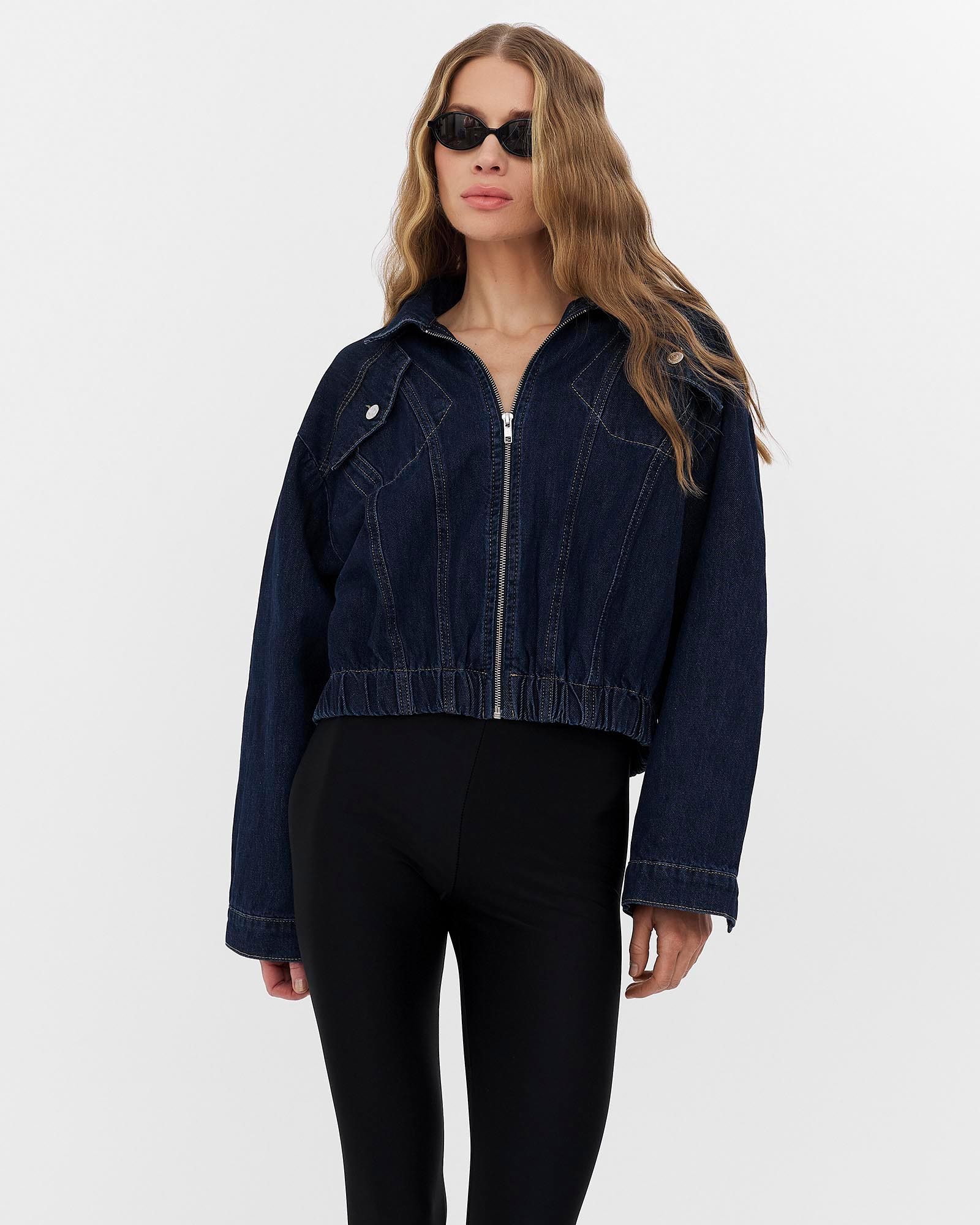 Однотонна куртка-бомбер вільного крою. Модель з відкладним коміром, довгими рукавами, опущеними плечовими швами, імітацією нагрудних кишень з...