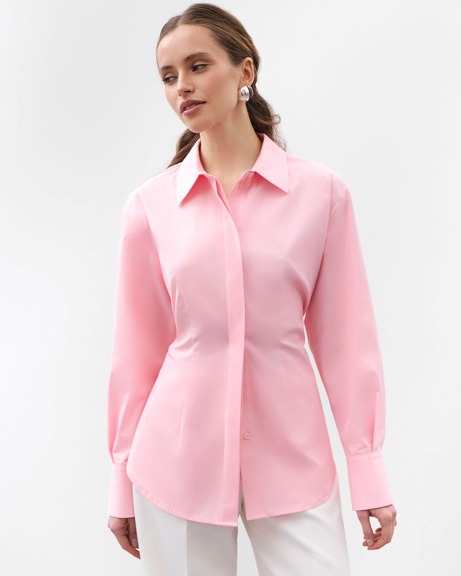Однотонна сорочка приталеного крою із зав'язкою ззаду. Модель з класичним відкладним коміром, довгими рукавами з широкими манжетами, скругленим...
