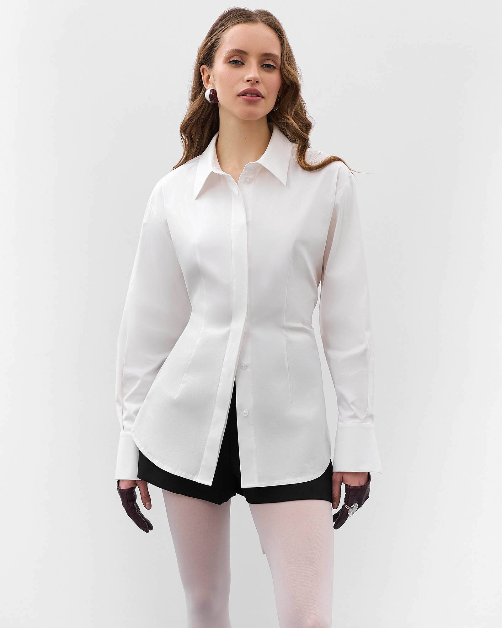 Однотонна сорочка приталеного крою із зав'язкою ззаду. Модель з класичним відкладним коміром, довгими рукавами з широкими манжетами, скругленим...