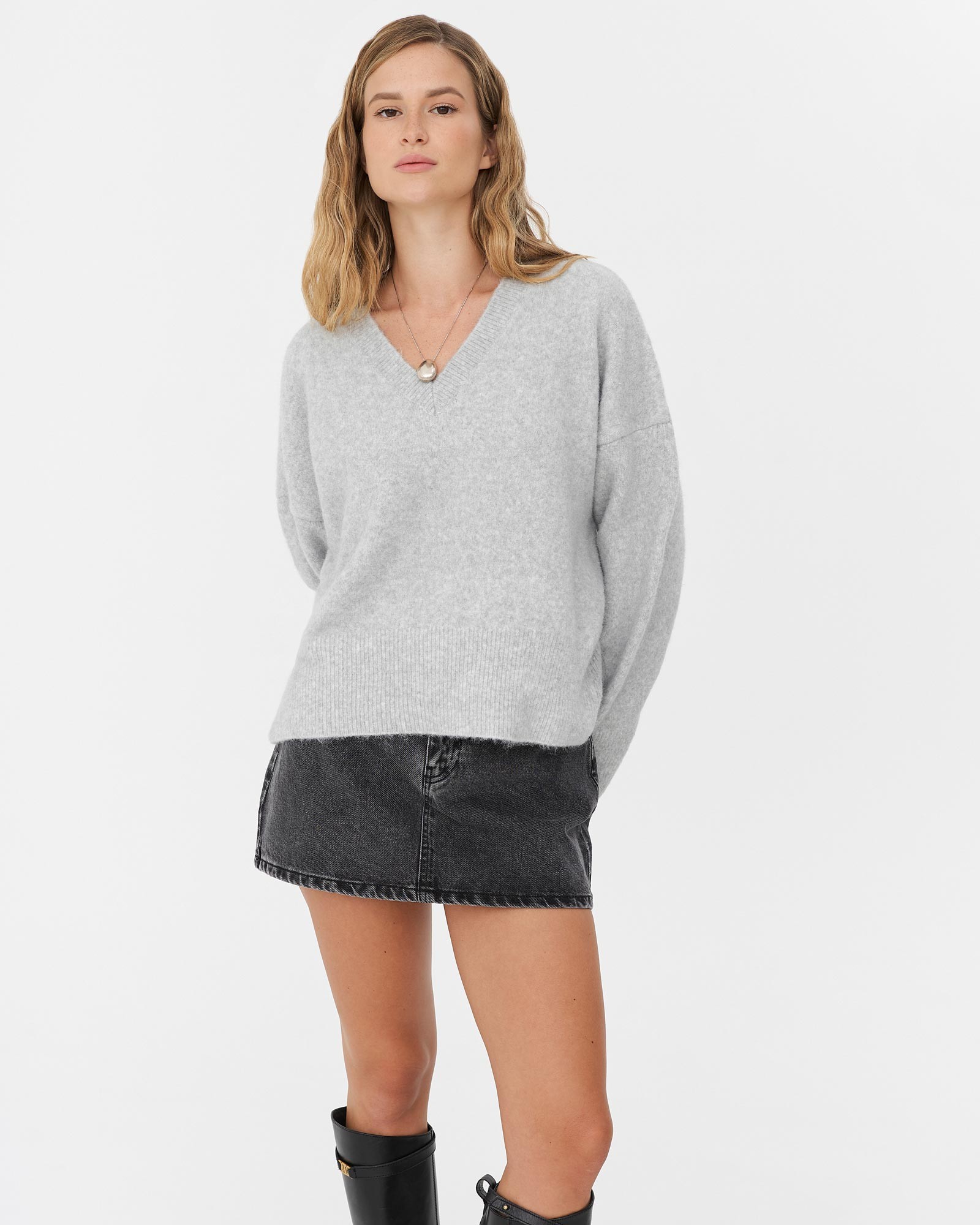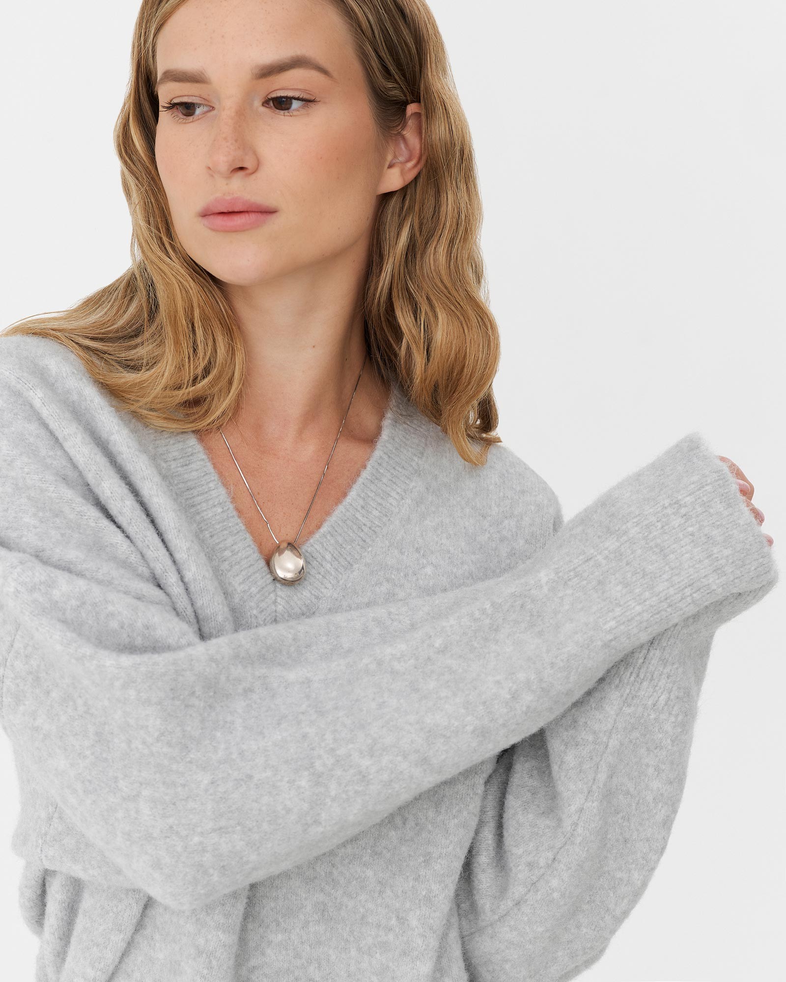 Однотонний трикотажний пуловер вільного крою. Модель з V-подібним вирізом, опущеною лінією плечей та довгими рукавами-кльош.