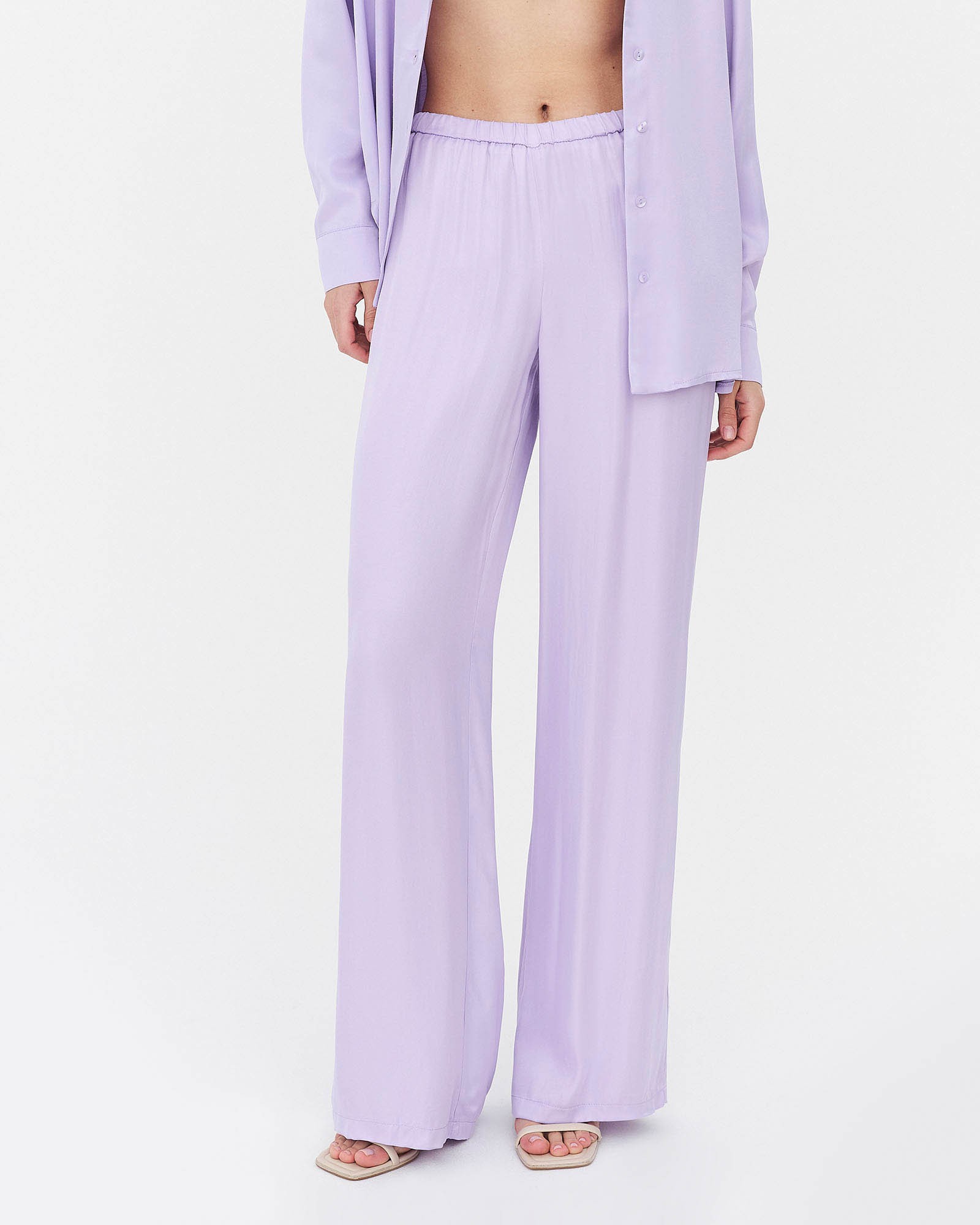 Однотонні сатинові штани вільного крою з високою посадкою. Модель з еластичним поясом та рівним обробленим низом. На моделі розмір S.