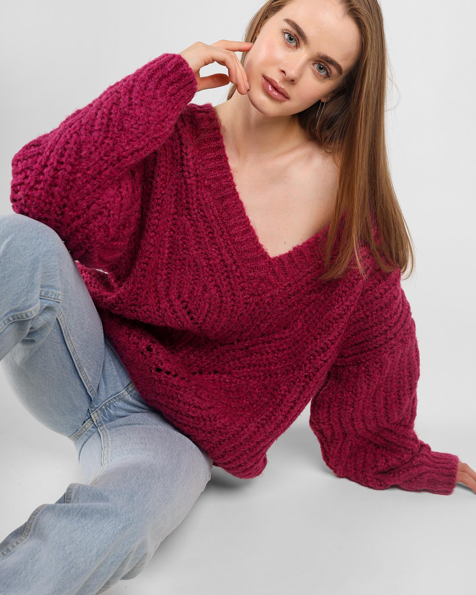 Светр прямого крою з комбінованим плетеним візерунком. Стильна модель з V-подібним вирізом, довгими рукавами та опущеною лінією плеча. Низ та...