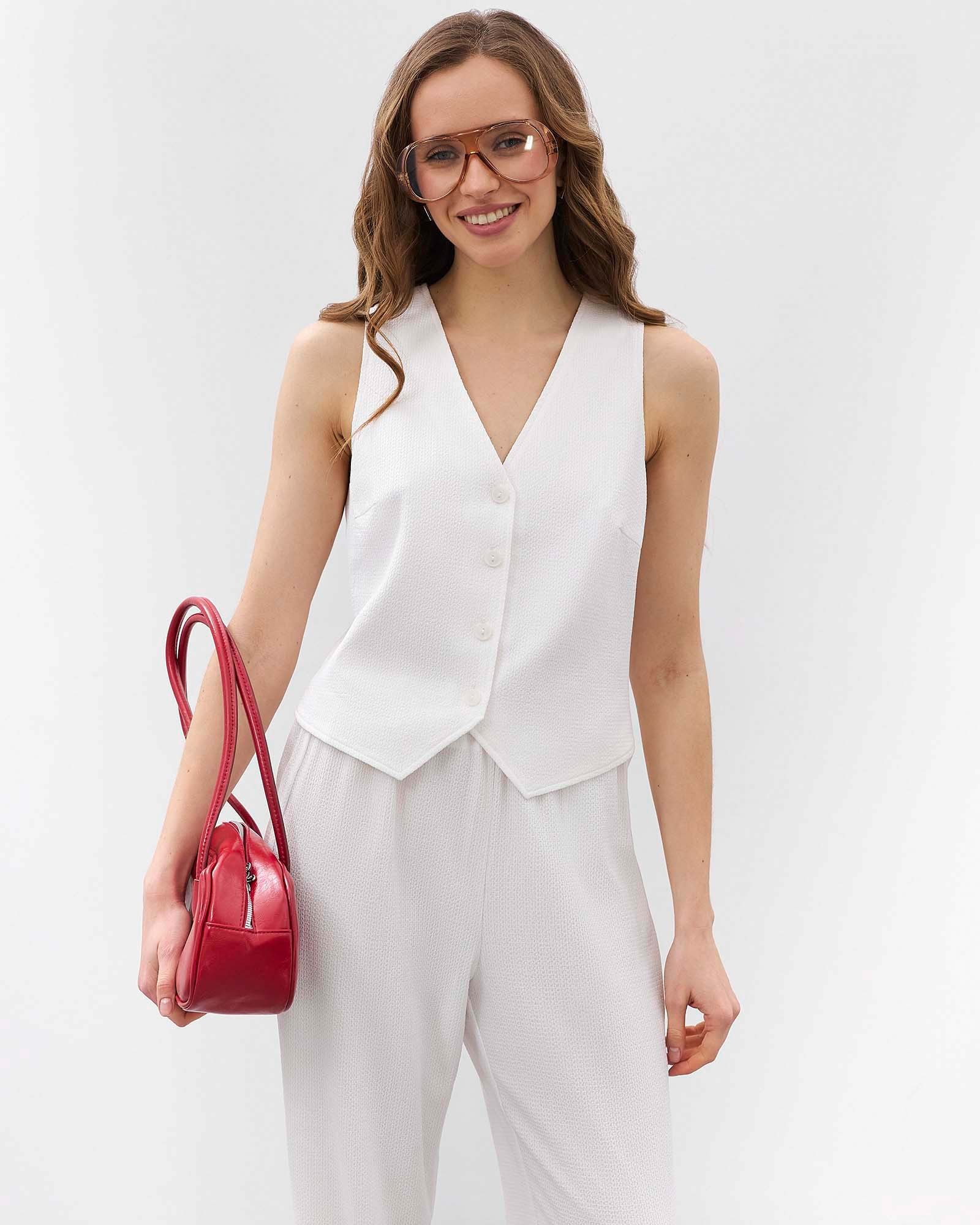 Однотонний костюм-двійка з текстурованої тканини. Модель представлена жилетом з V-подібним вирізом та застібкою на ґудзики спереду і штанами...