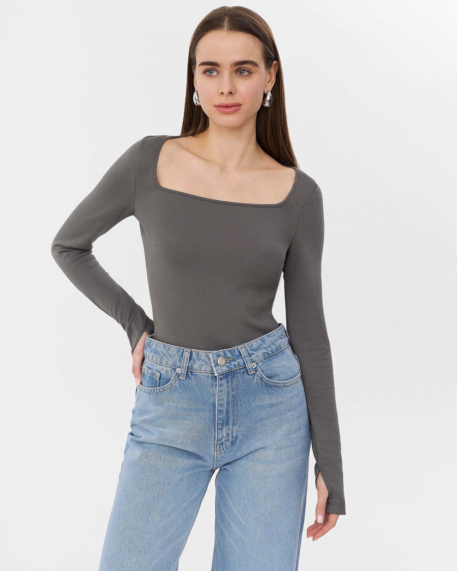Однотонний базовий лонгслів приталеного крою з прямокутним вирізом та довгими рукавами. На моделі розмір S.