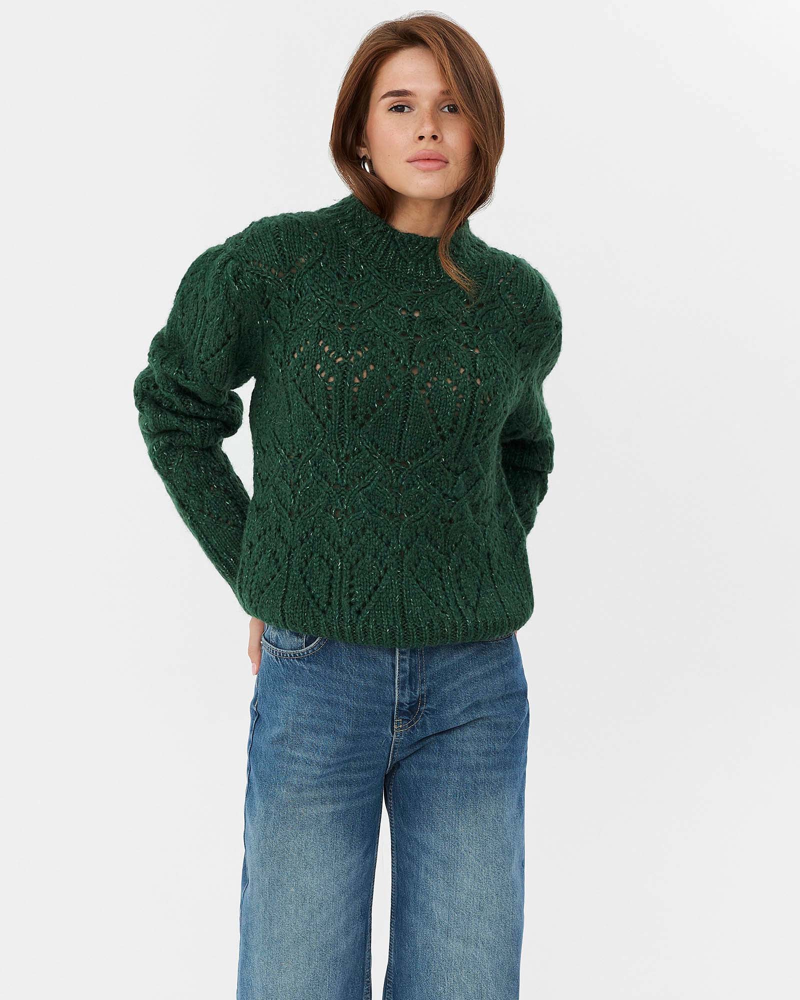 Однотонний вкорочений джемпер з перфорацією та коміром-стійкою. Модель прямого крою з довгими рукавами та опущеною лінією плечей.