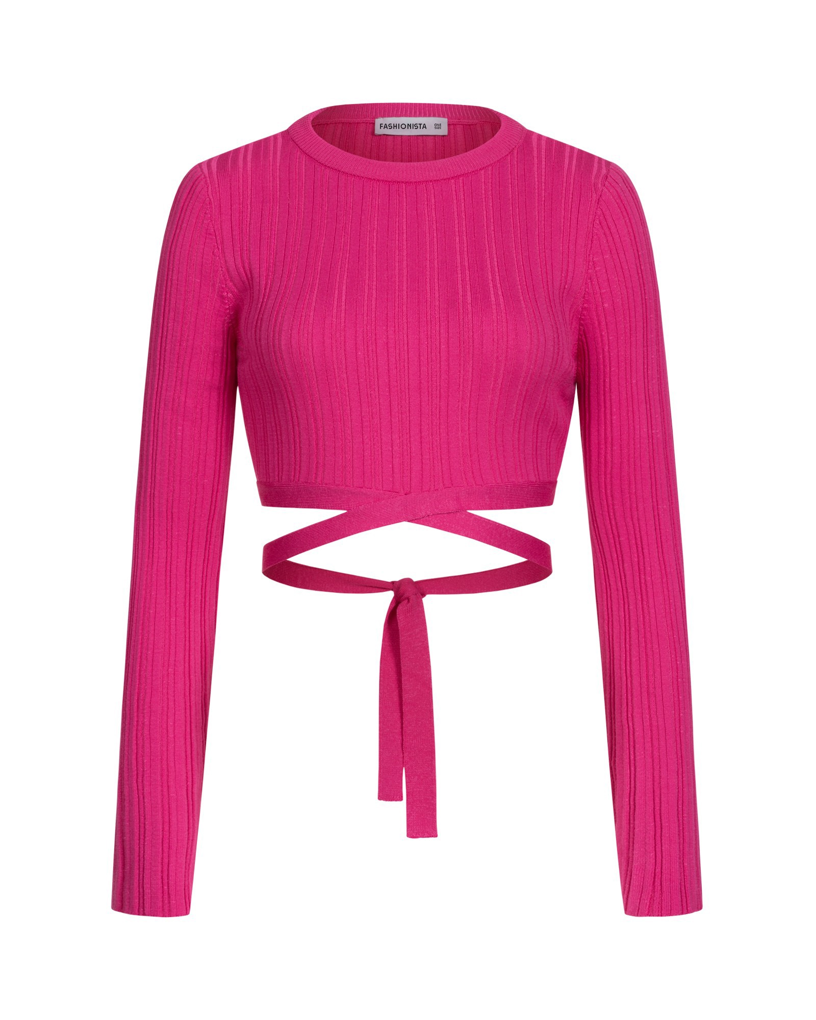 Однотонний вкорочений джемпер в рубчик. Модель з круглою горловиною, декоративною зав'язкою ззаду та довгими рукавами.
