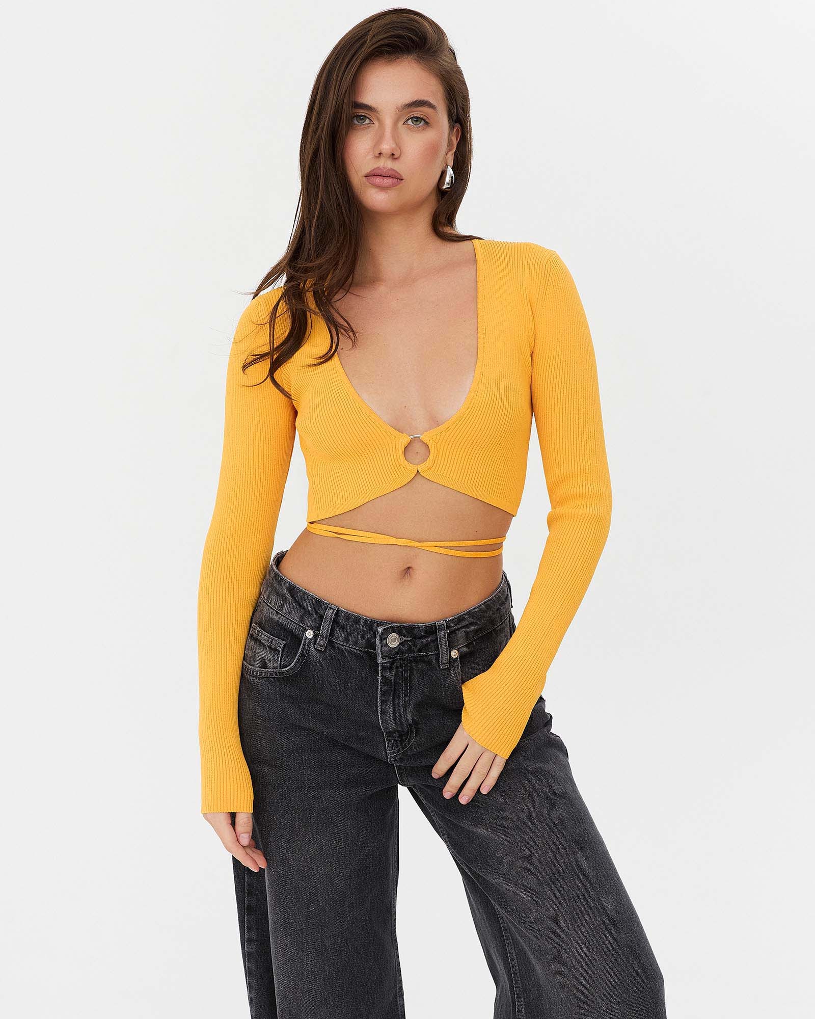 Однотонний текстурований джемпер із зав'язкою, металевим кільцем спереду та розрізом ззаду. Вкорочена модель з глибоким V-подібним вирізом та...