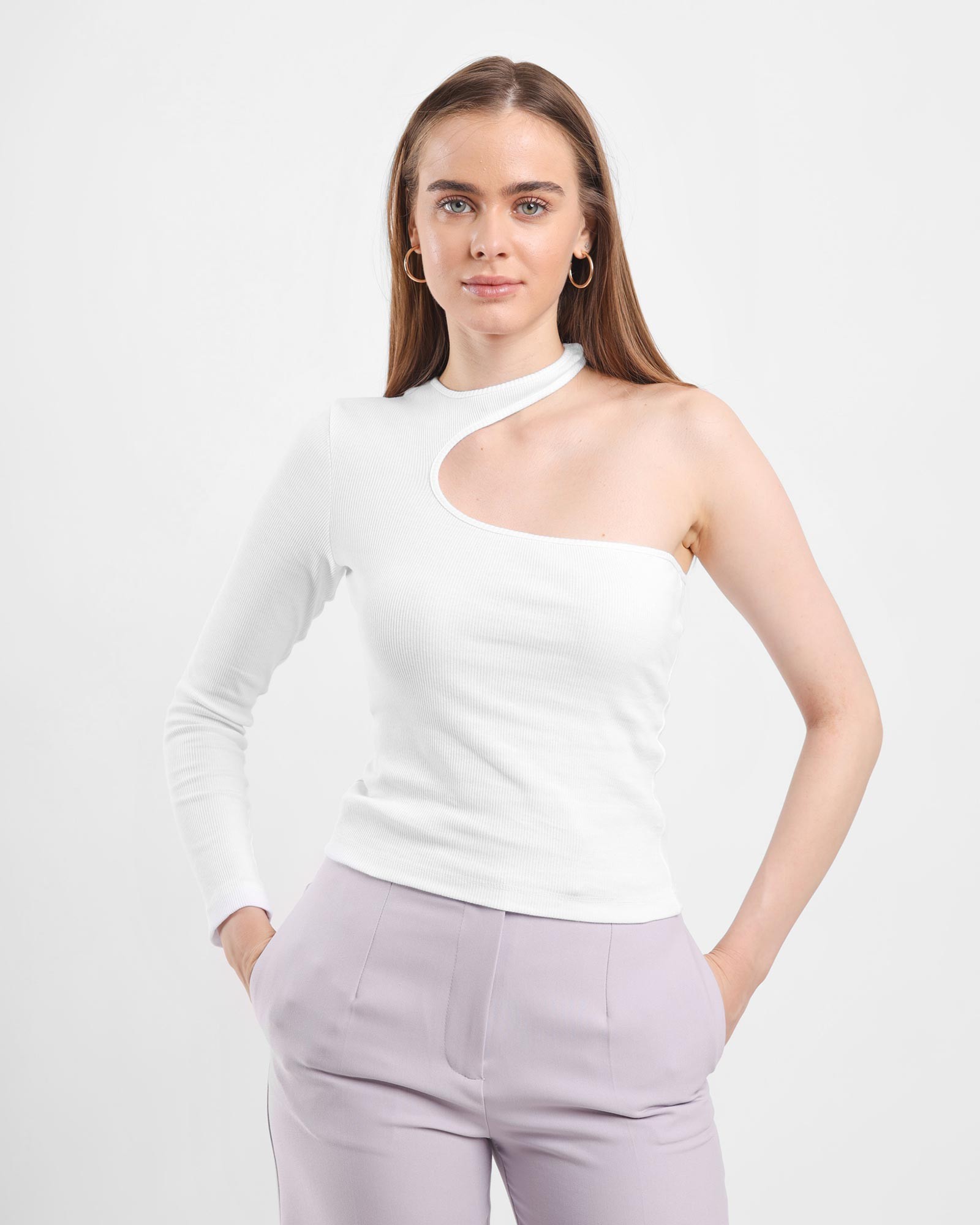 Однотонний джемпер приталеного крою з текстурованої тканини. Модель з круглою горловиною, ефектним вирізом спереду і ззаду, відкритим плечем та...