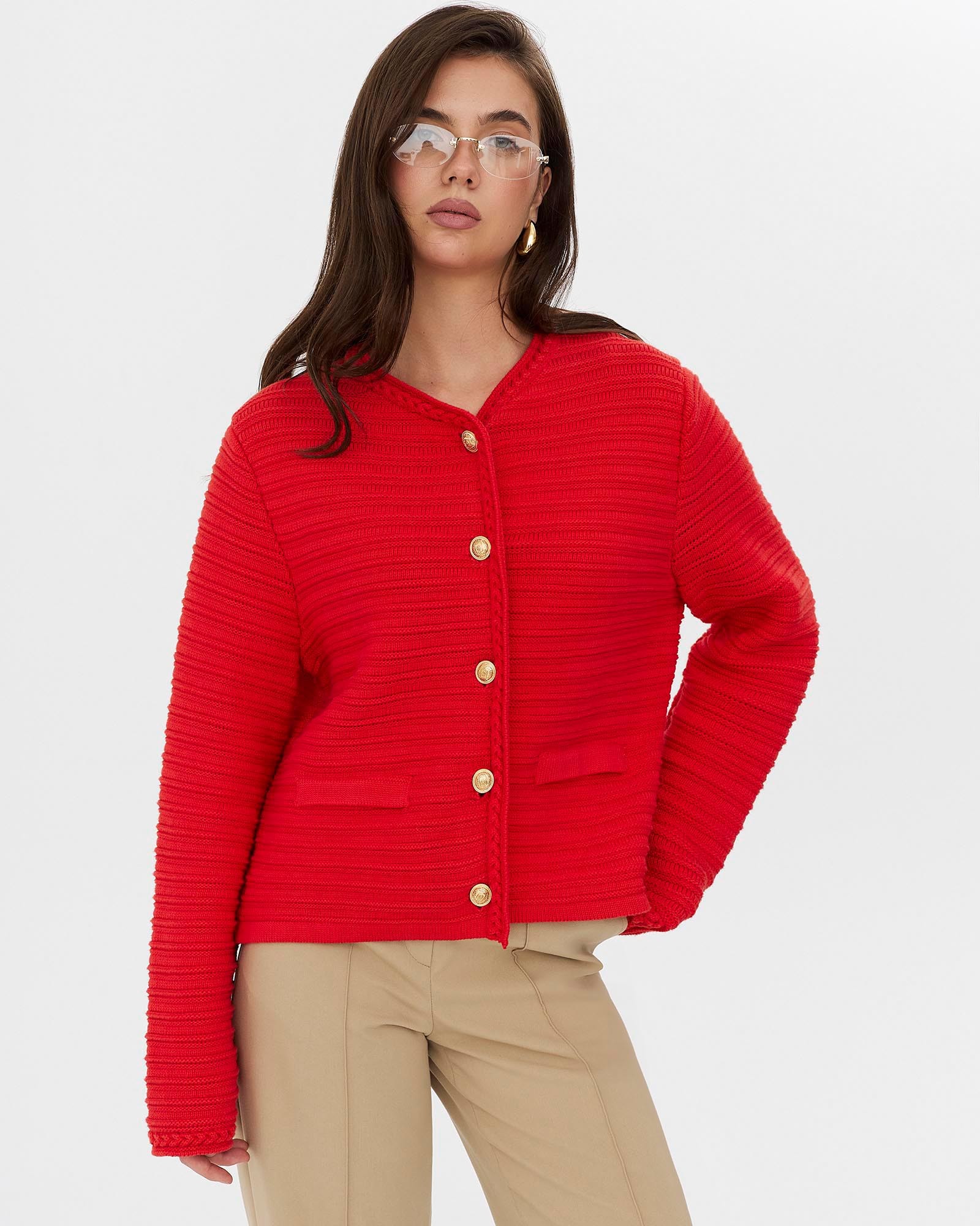 Однотонний трикотажний кардиган прямого крою з довгими рукавами та імітацією кишень. Застібається на ґудзики спереду.