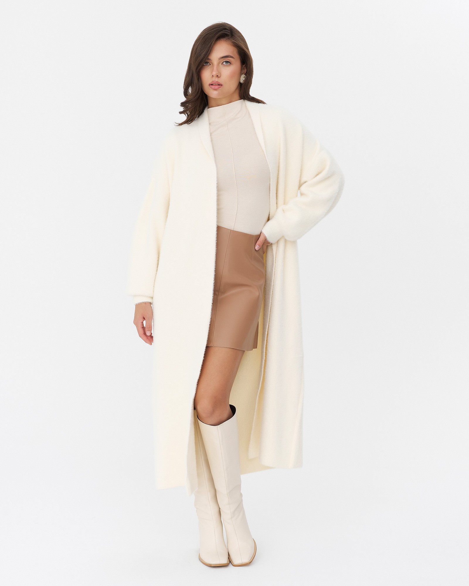 Однотонний подовжений кардиган з відкладним коміром, довгими рукавами та опущеною лінією плечей.