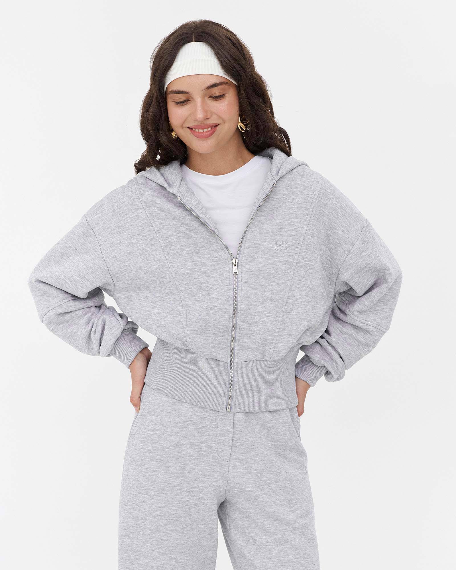 Однотонне трикотажне худі з декоративними швами. Модель з довгими рукавами, застібкою на блискавку спереду та капюшоном. Манжети рукавів та манжет...