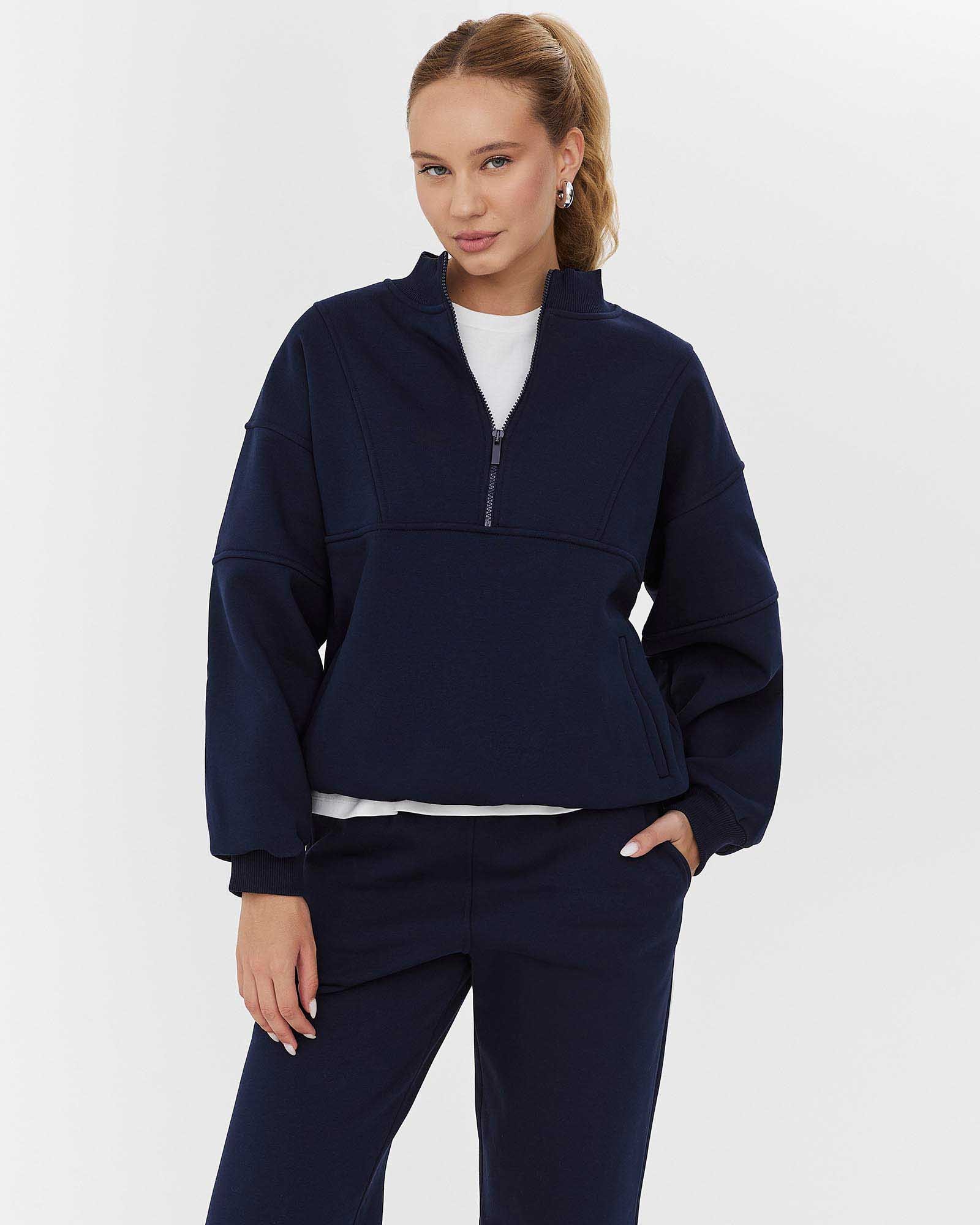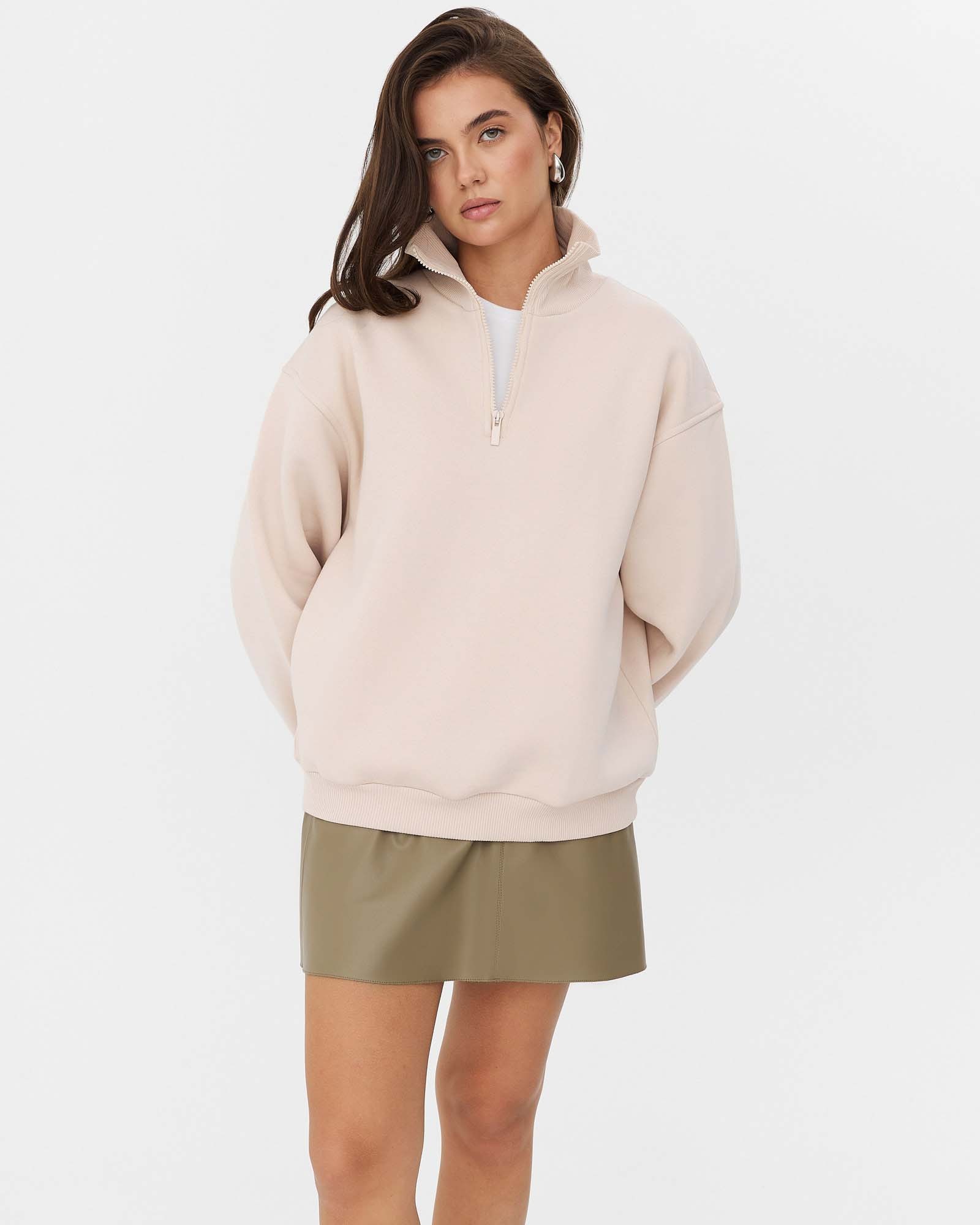 Світшот вільного крою з декоративними швами, що виконані в тон кольору тканини. Модель з горловиною-стійкою, застібкою на блискавку спереду,...