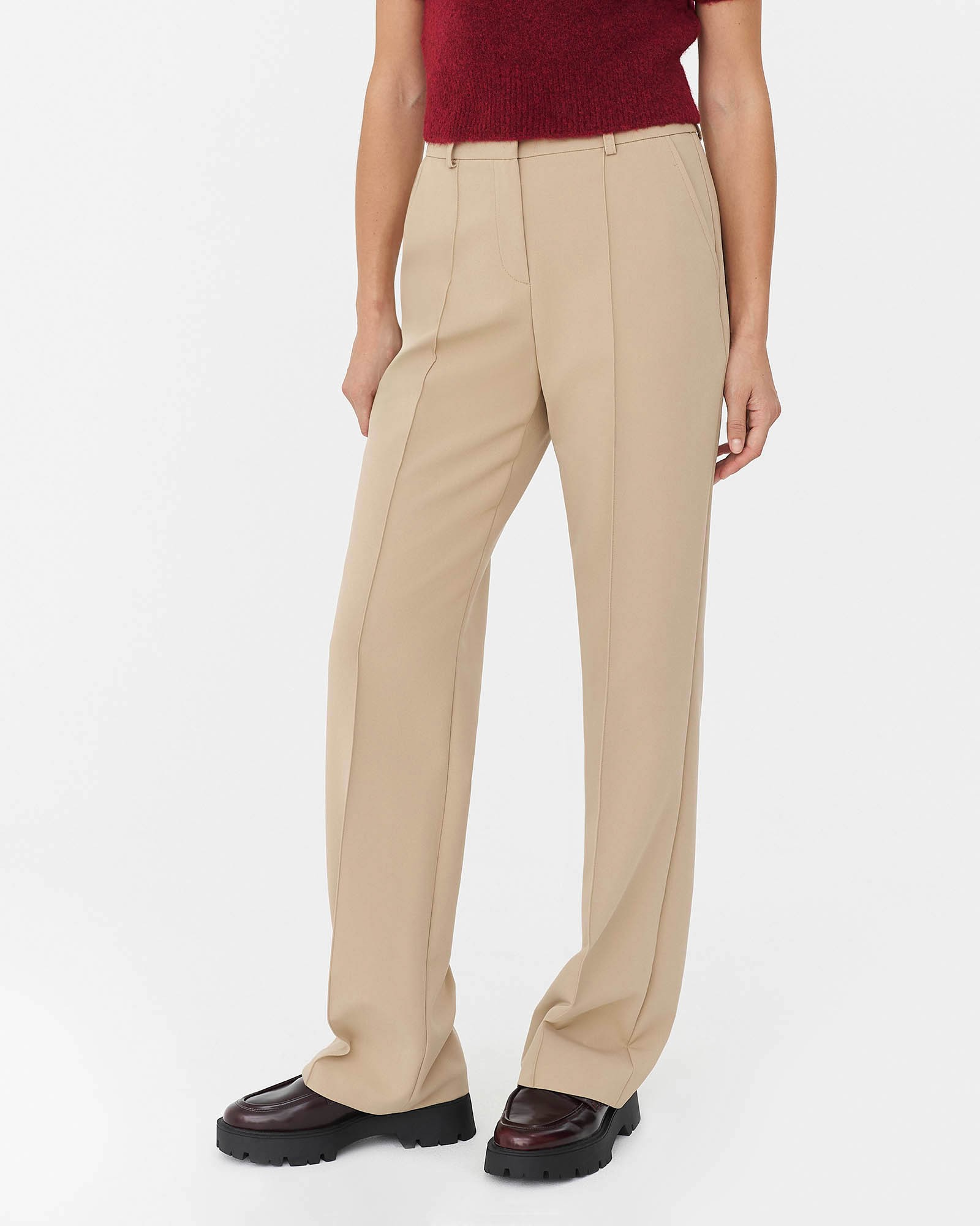 Однотонні штани прямого крою з декоративними швами та розрізами спереду. Модель з високою посадкою та імітацією прорізних кишень ззаду....