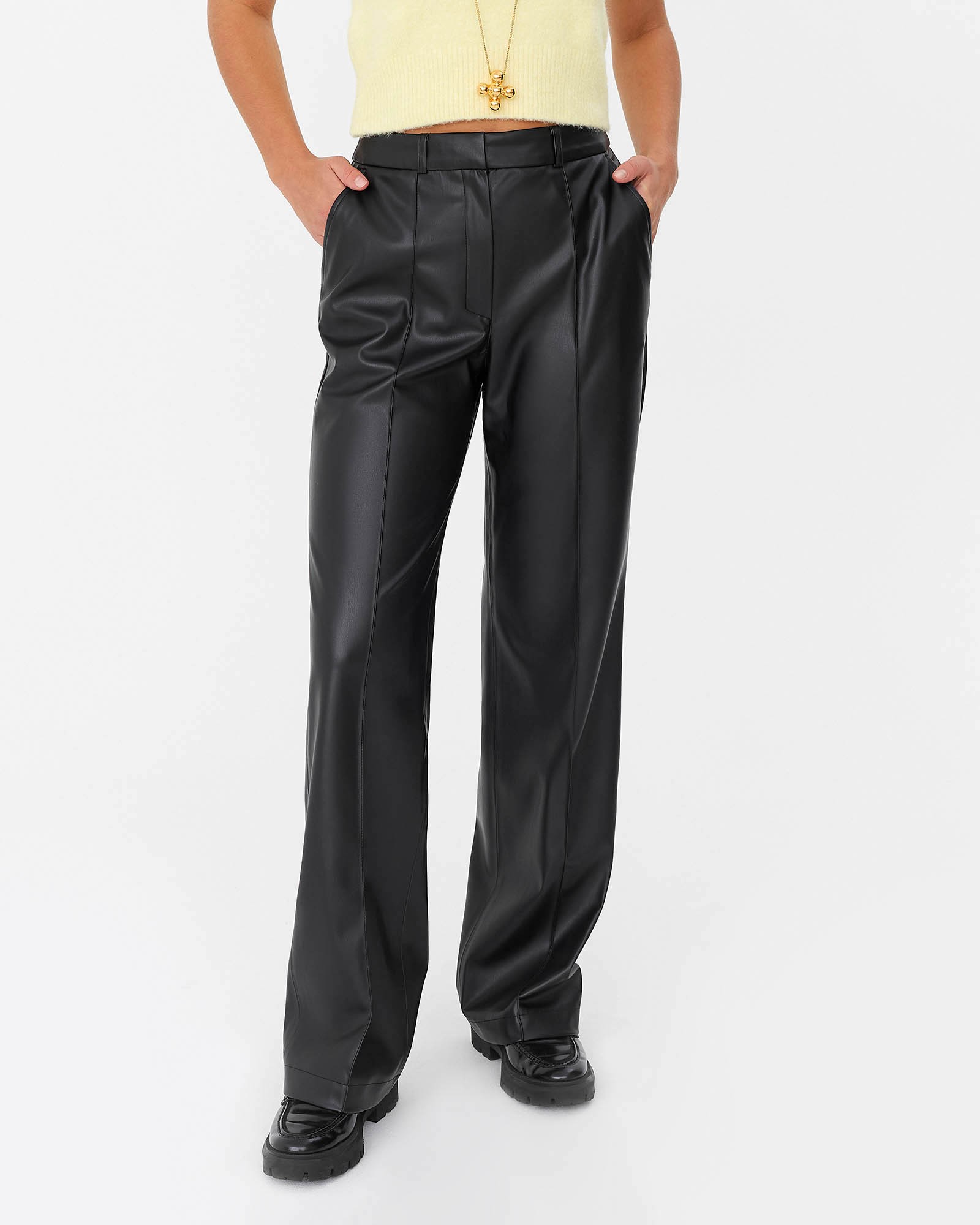 Штани прямого крою зі штучної шкіри. Модель з високою посадкою, декоративними швами, боковими кишенями та накладними кишенями ззаду. Петельки для...