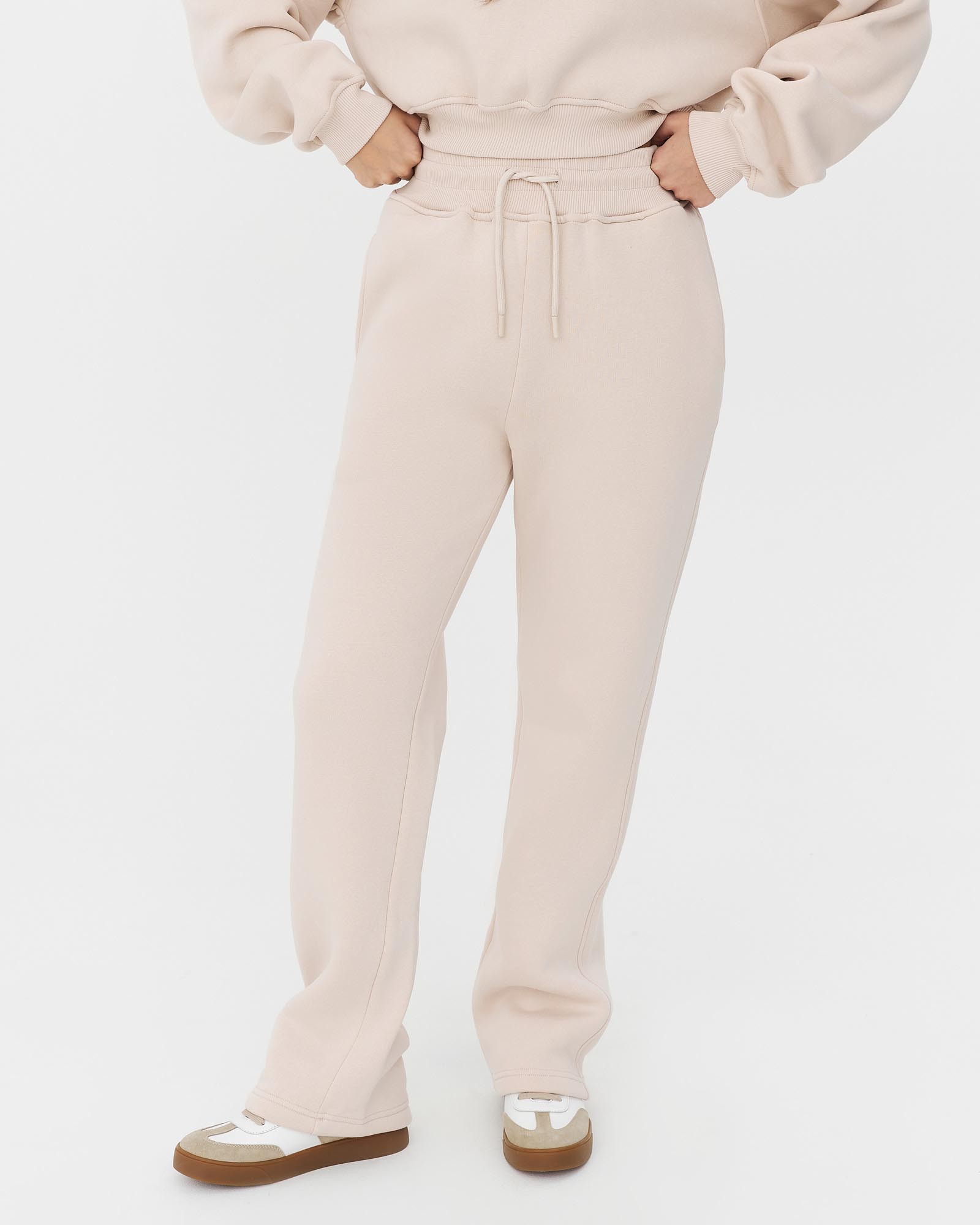 Однотонні штани прямого крою з еластичним широким поясом зі шнурівкою для регулювання, боковими кишенями та рівним обробленим низом. Модель...