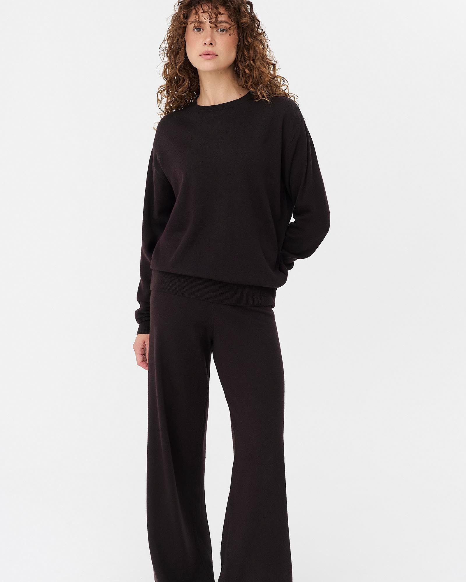 Однотонні трикотажні штани-палацо з високою посадкою, еластичним поясом та рівним обробленим низом.
