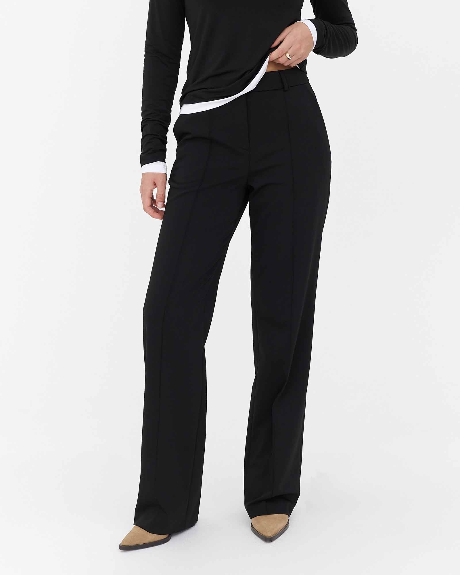 Однотонні штани прямого крою з високою посадкою. Модель з декоративними швами спереду, боковими кишенями та імітацією кишені ззаду. Застібаються...