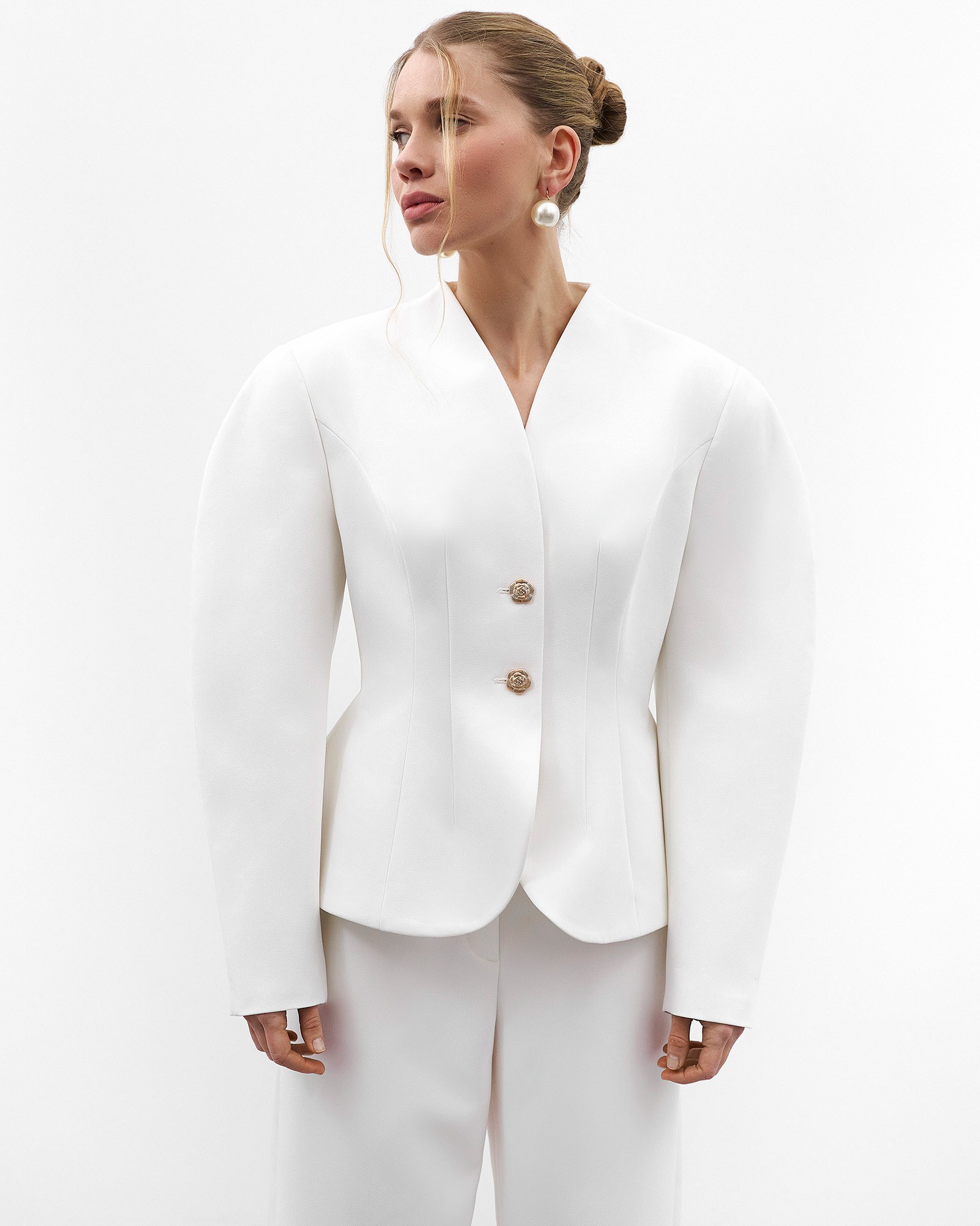 Трендовий однотонний жакет приталеного крою. Однобортна модель з акцентними плечима, довгими рукавами та скругленим низом. Застібається на ґудзики...