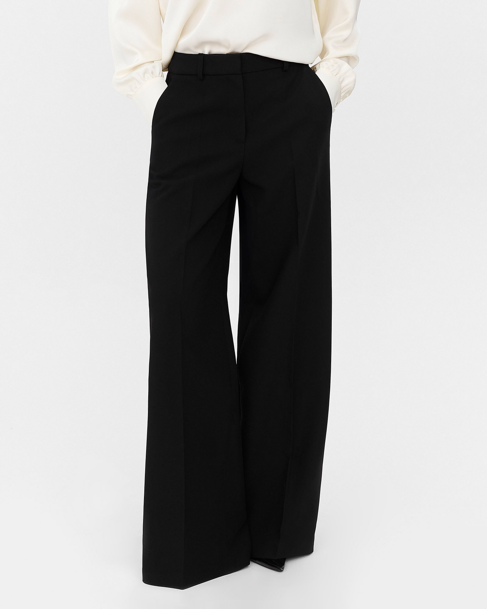 Класичні штани-палацо з виточками та запрасованими стрілками спереду. Модель з високою посадкою, петельками для ременя на поясі, боковими кишенями...