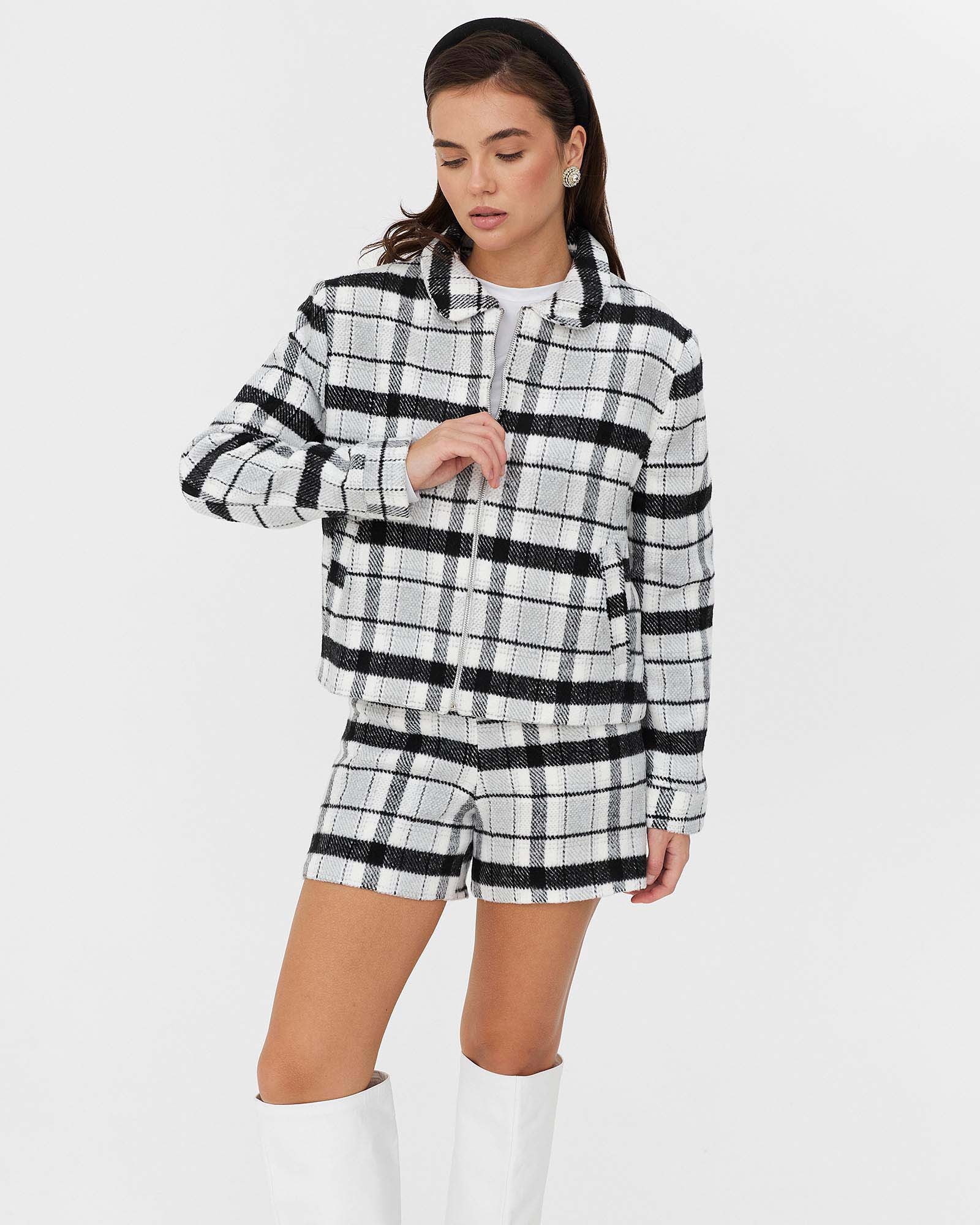 Картатий жакет з класичним відкладним коміром, двома кишенями та довгими рукавами з манжетами. Застібається на блискавку спереду. На моделі...