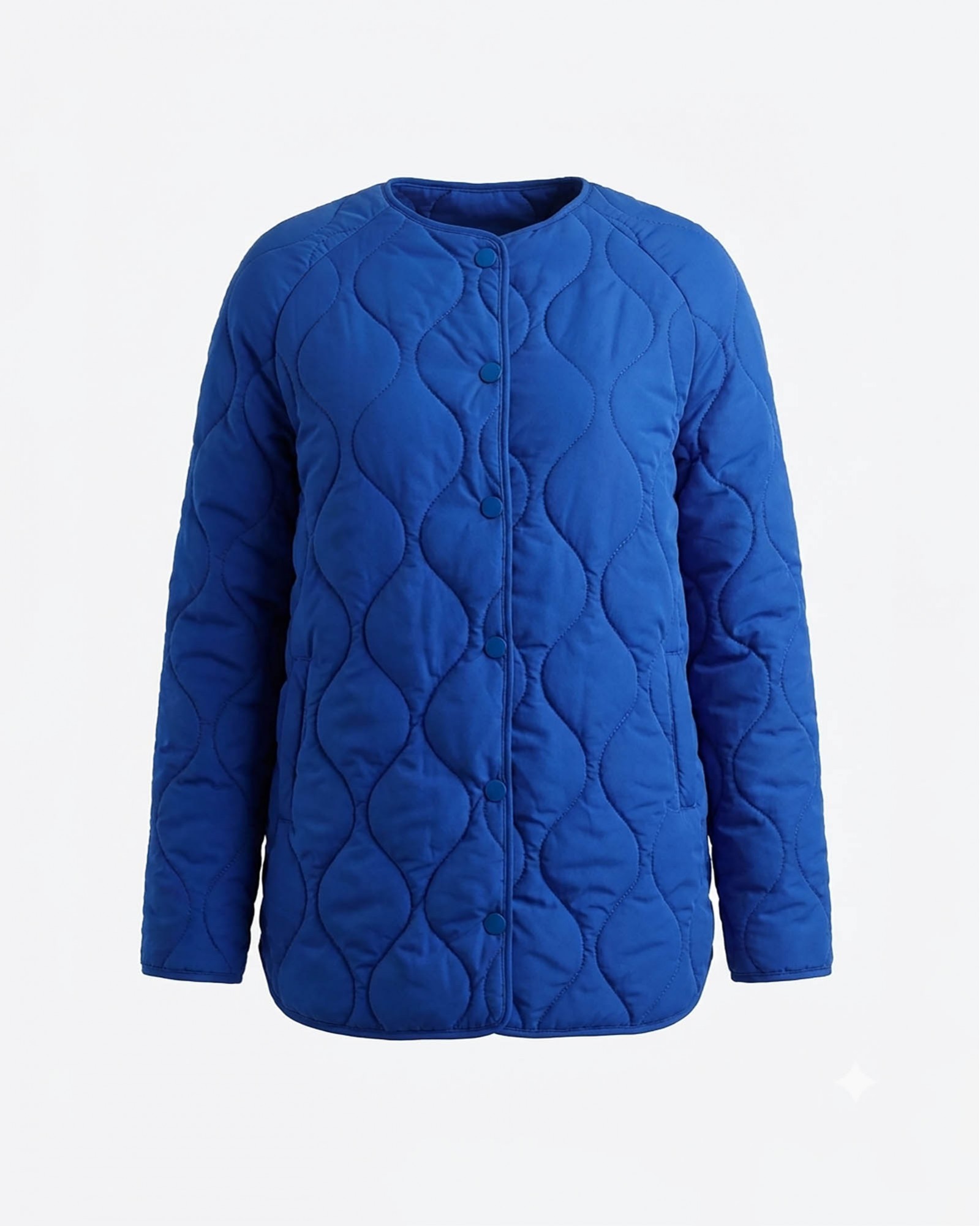 Однотонна стьобана куртка прямого крою із застібкою на заклепки. Трендова модель з довгими рукавами, асиметричним низом та боковими кишенями....