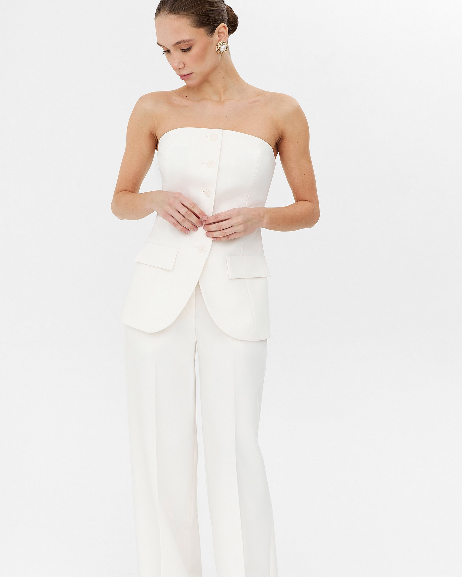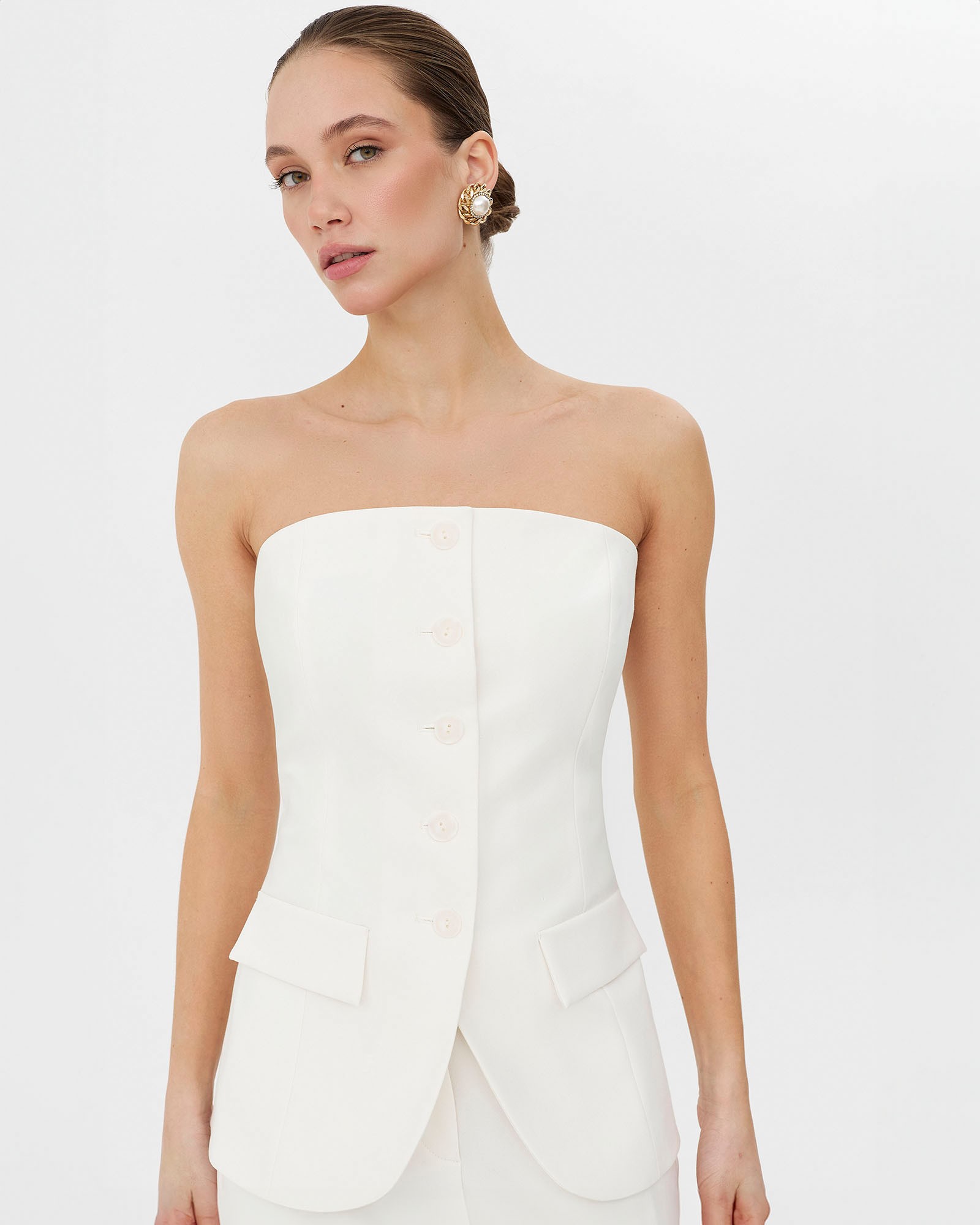 Однотонний корсет з відкритими плечима, розрізом та імітацією кишень спереду. Застібається на ґудзики спереду. На моделі розмір S.