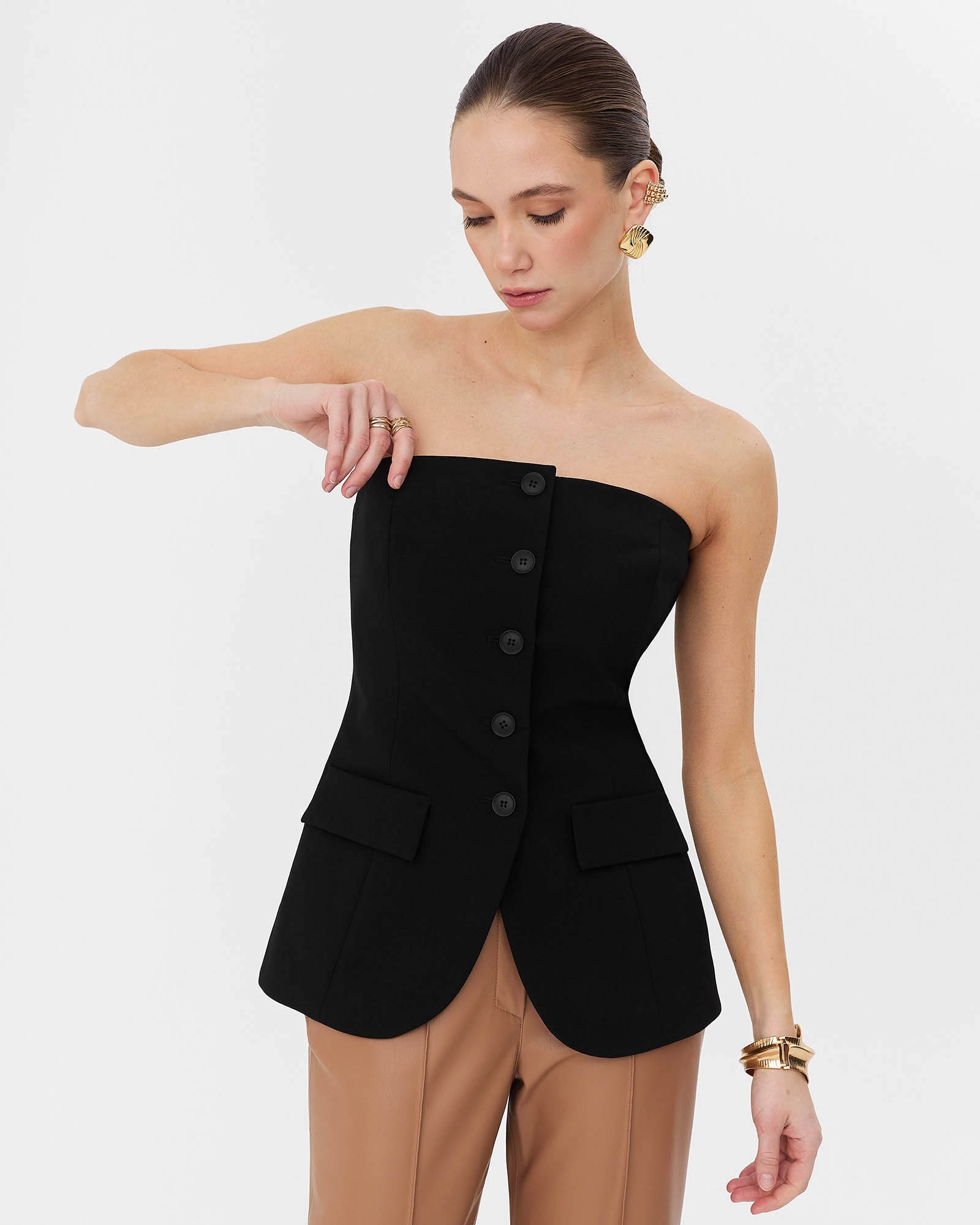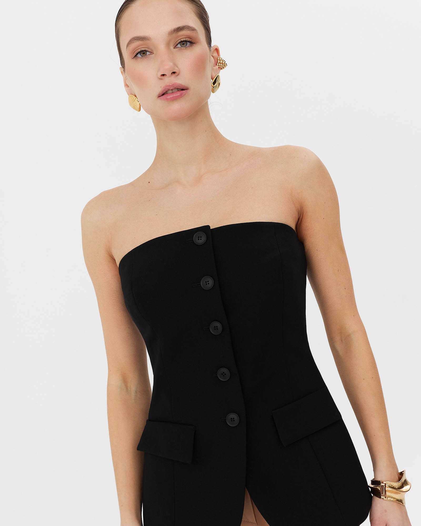 Однотонний корсет з відкритими плечима, розрізом та імітацією кишень спереду. Застібається на ґудзики спереду. На моделі розмір S.