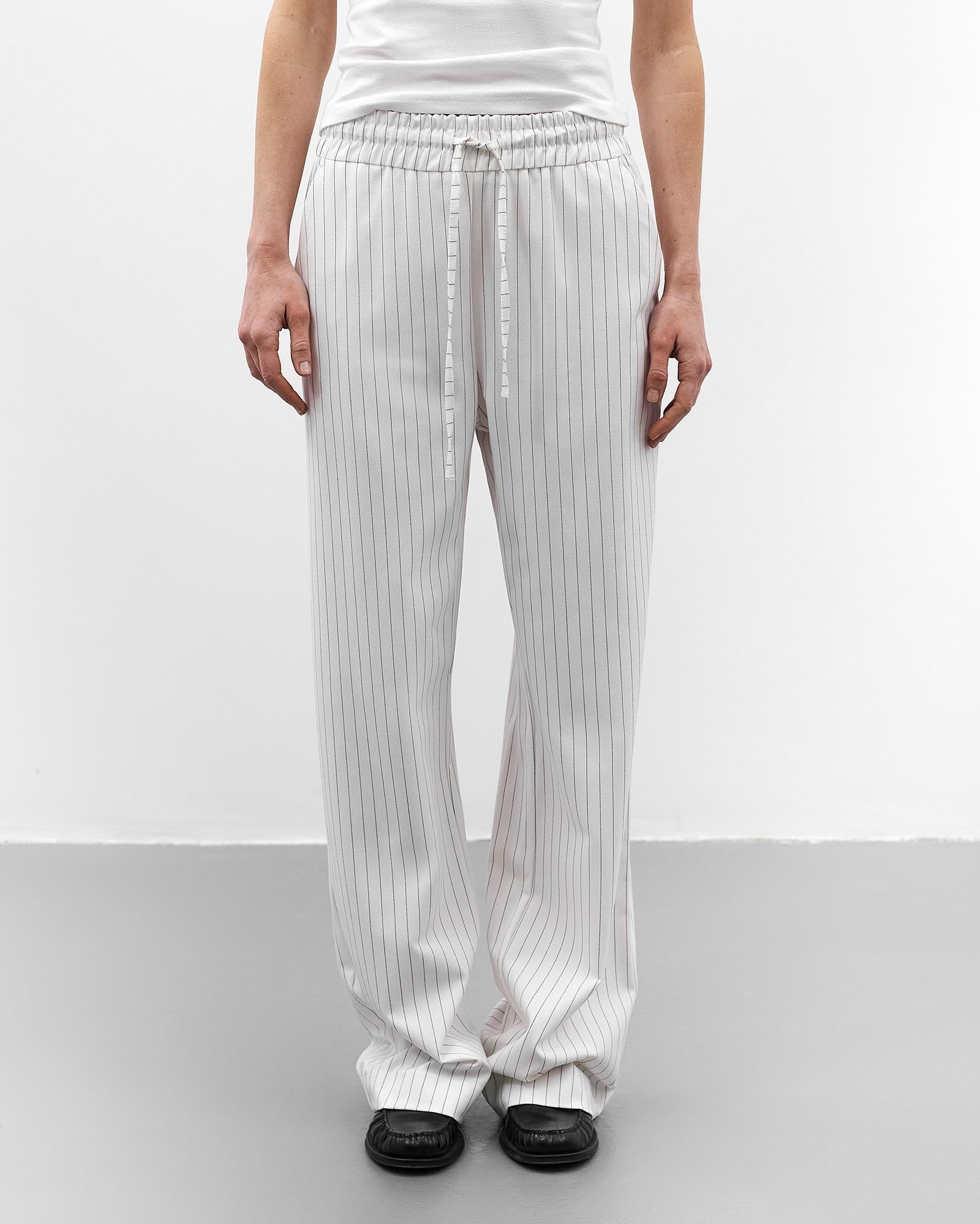 Однотонні штани у смужку прямого крою. Кежуал модель з високою посадкою, еластичним поясом із зав'язкою, боковими кишенями та накладними кишенями...