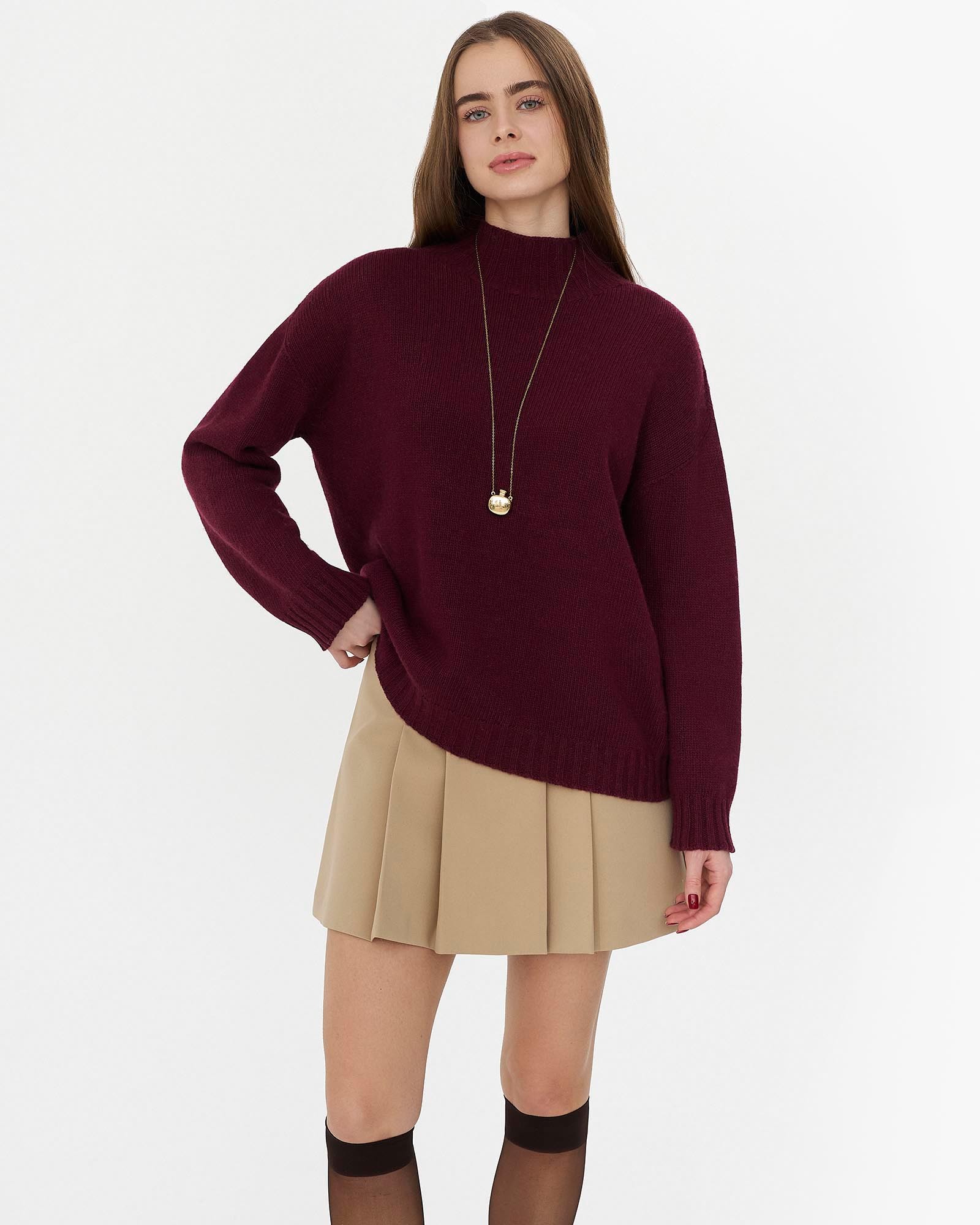 Однотонний светр прямого крою з коміром стійкою та довгими рукавами. Горловина, низ та рукава оброблені плетенням-резинка.