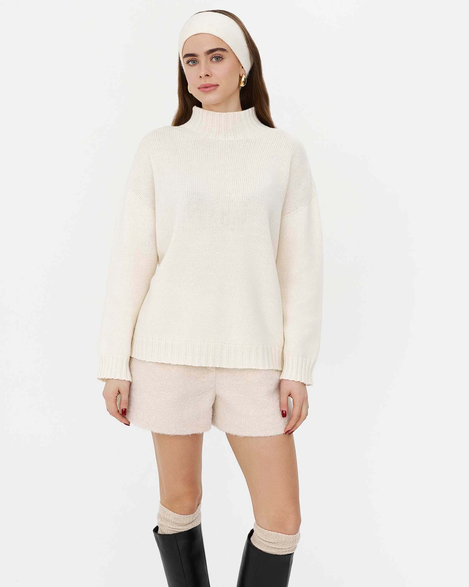 Однотонний светр прямого крою з коміром стійкою та довгими рукавами. Горловина, низ та рукава оброблені плетенням-резинка.