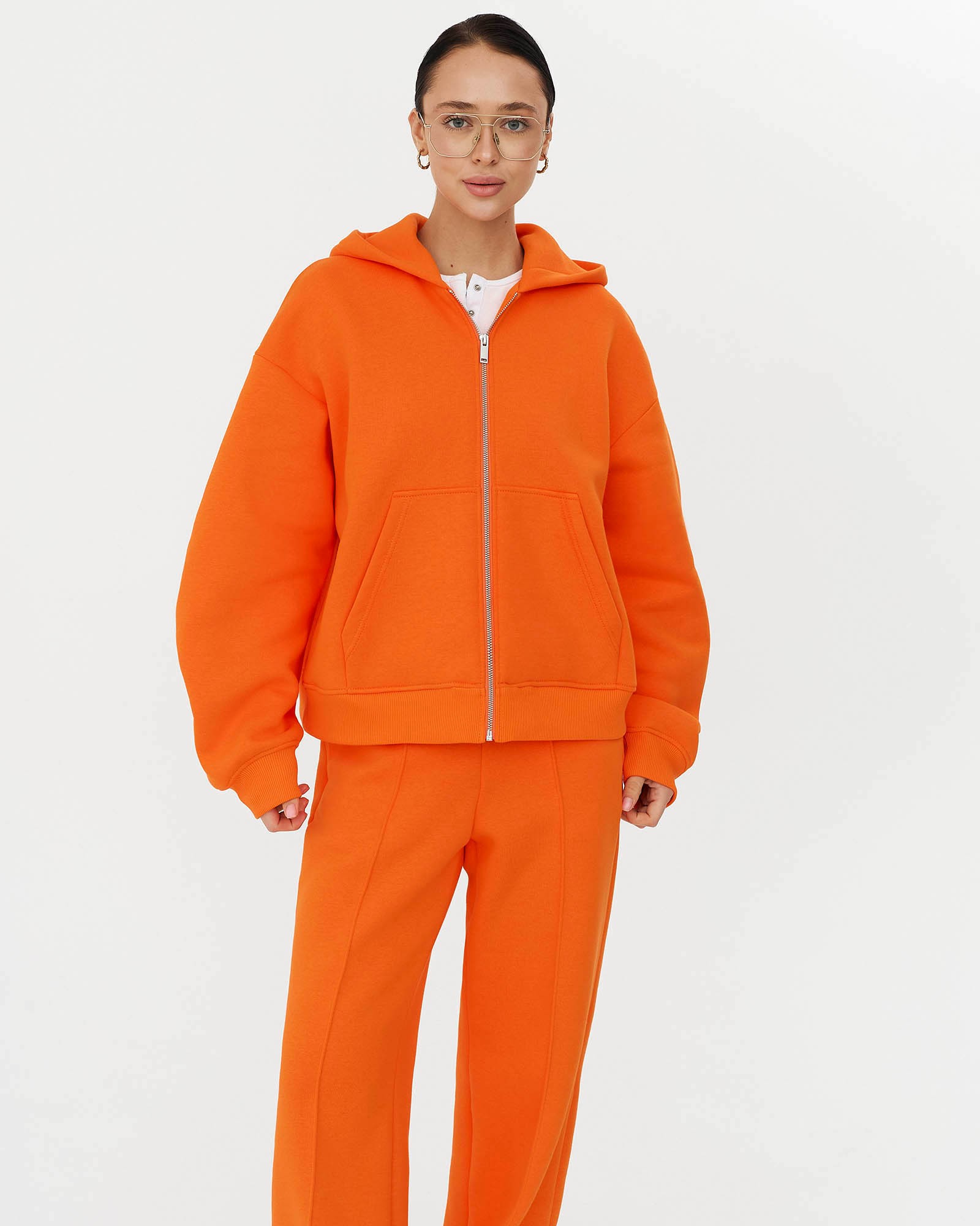 Однотонне худі із застібкою на блискавку та капюшоном. Модель з опущеними плечовими швами, довгими рукавами, накладними кишенями спереду та...