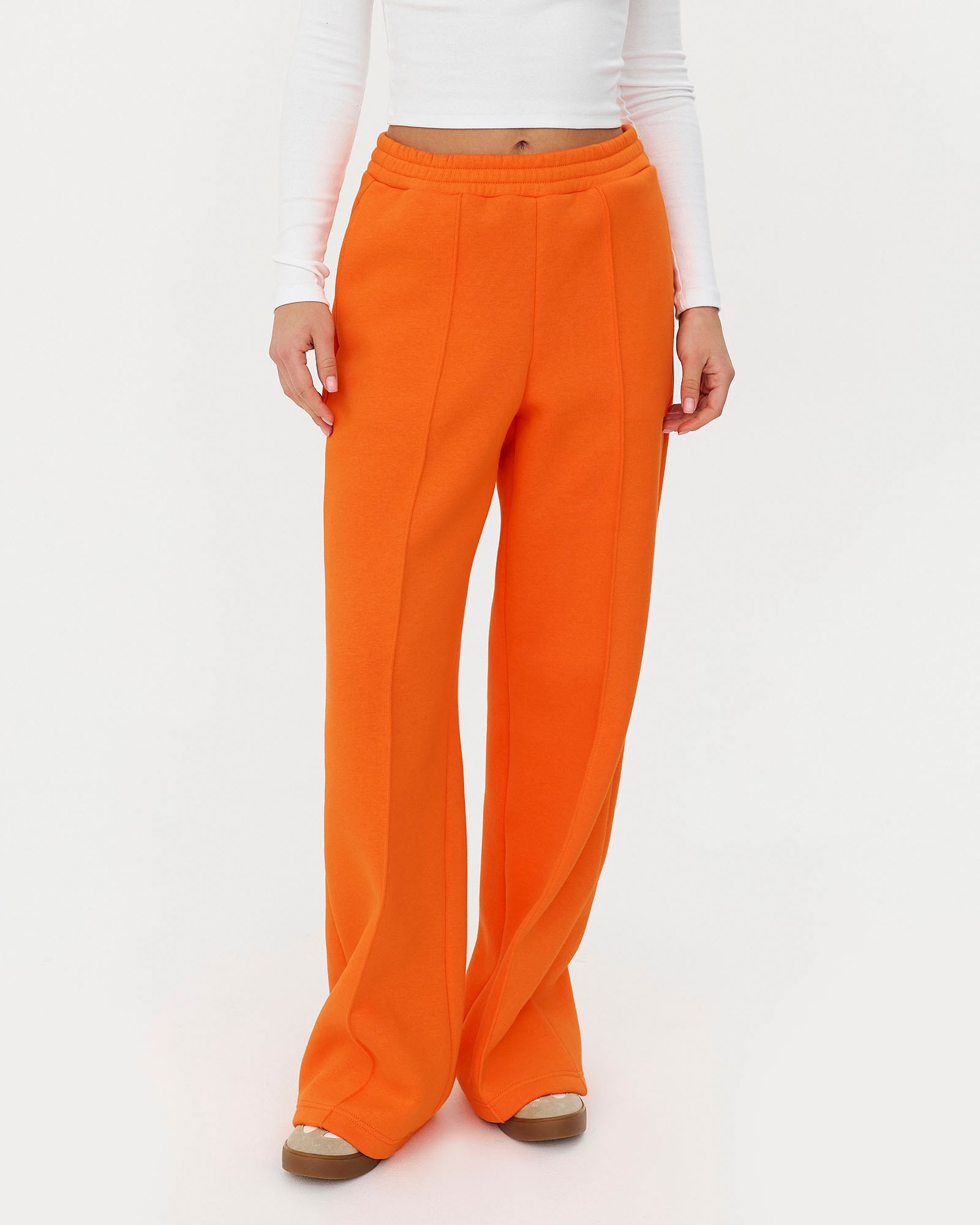 Однотонні штани-палацо з декоративними швами. Модель з високою посадкою, еластичним поясом, боковими кишенями та рівним обробленим низом. Утеплені...