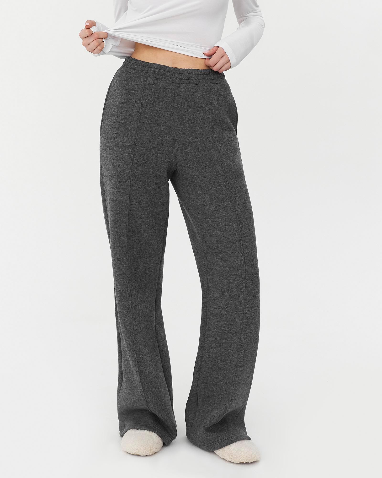 Однотонні штани-палацо з декоративними швами. Модель з високою посадкою, еластичним поясом, боковими кишенями та рівним обробленим низом. Утеплені...