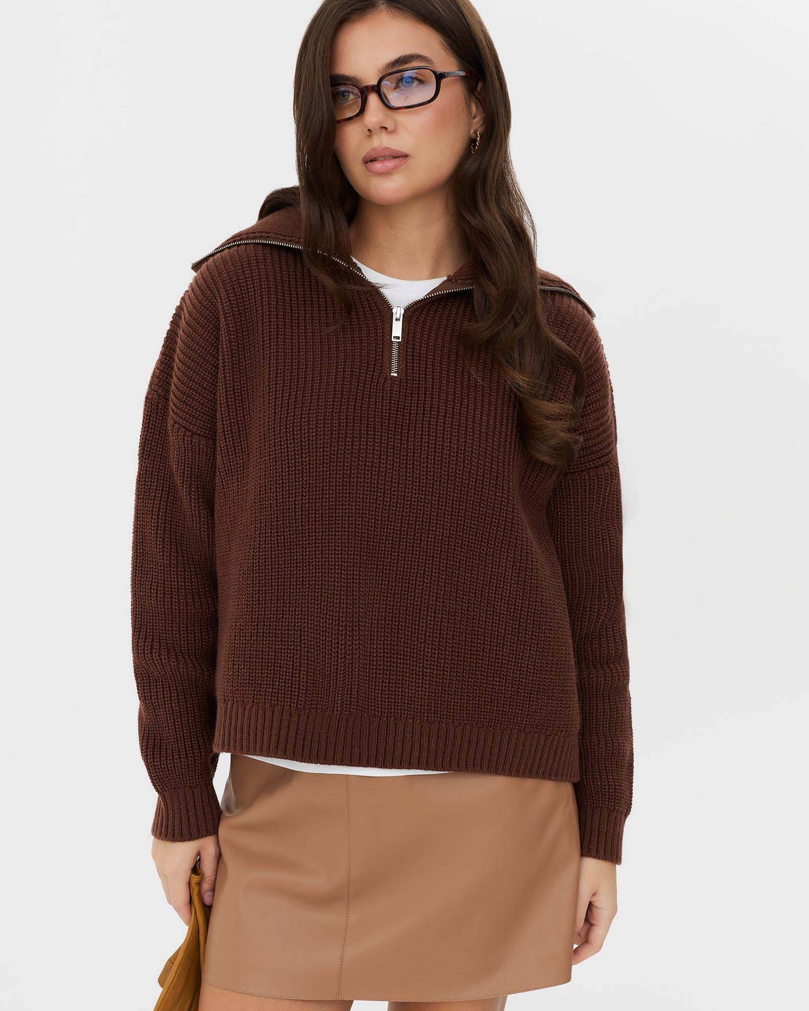 Однотонний светр прямого крою. Модель з широким відкладним коміром із застібкою на блискавку, опущеними плечовими швами та довгими рукавами.