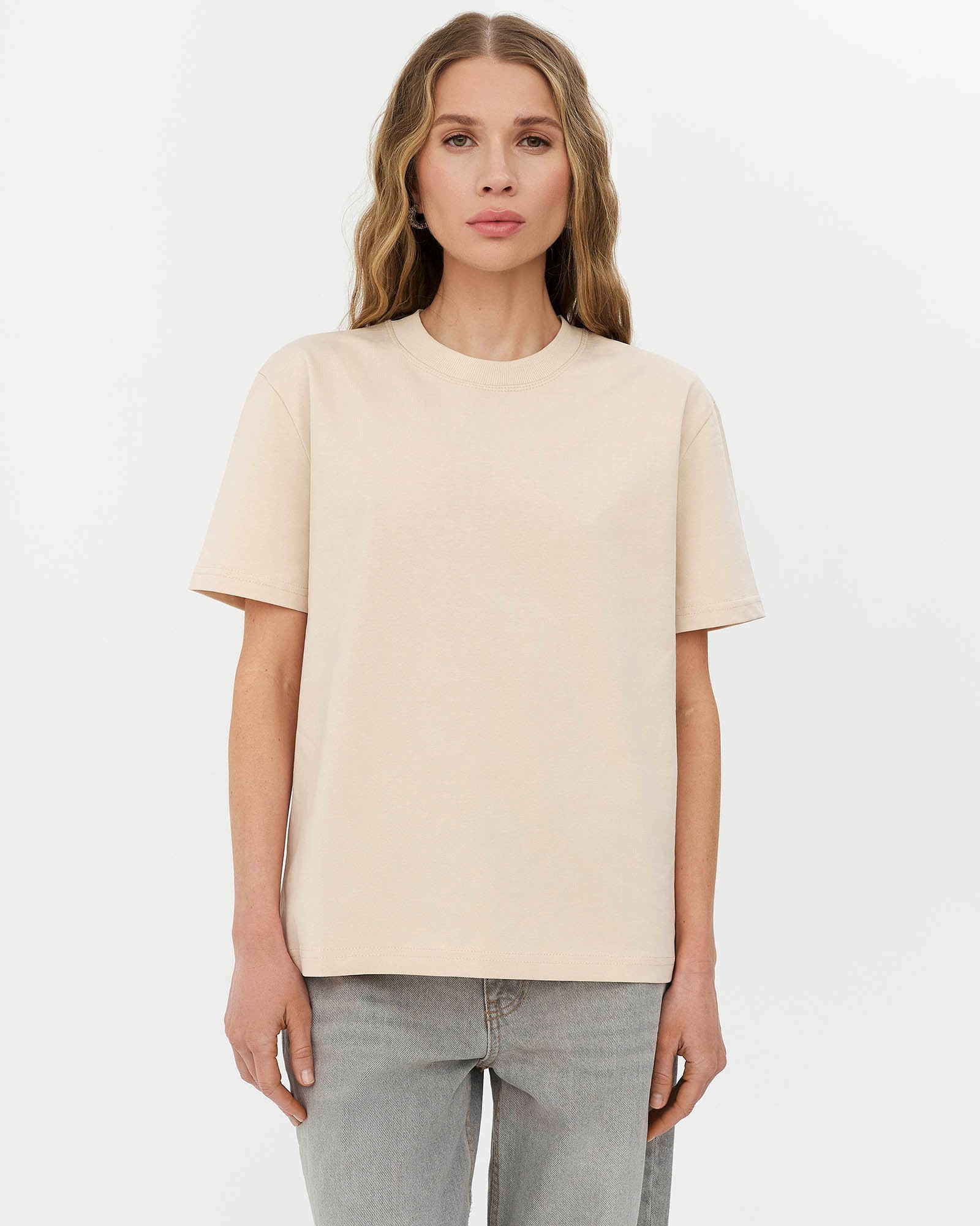 Однотонна футболка вільного крою з круглою горловиною, опущеними плечовими швами та короткими рукавами. На моделі розмір S.