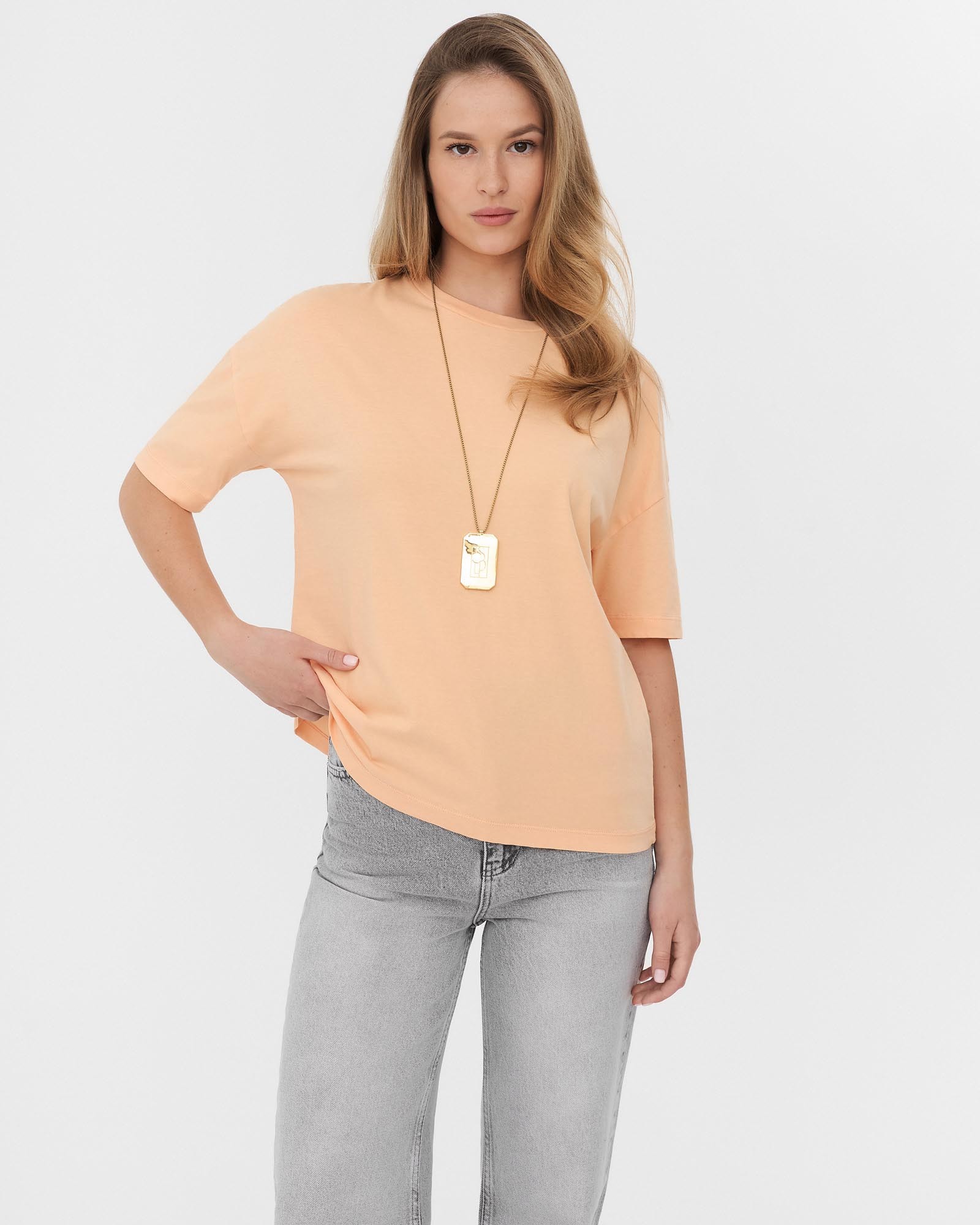 Однотонна футболка вільного крою з круглим вирізом. Модель з опущеними плечовими швами, подовженими рукавами та манжетами. На моделі розмір S.