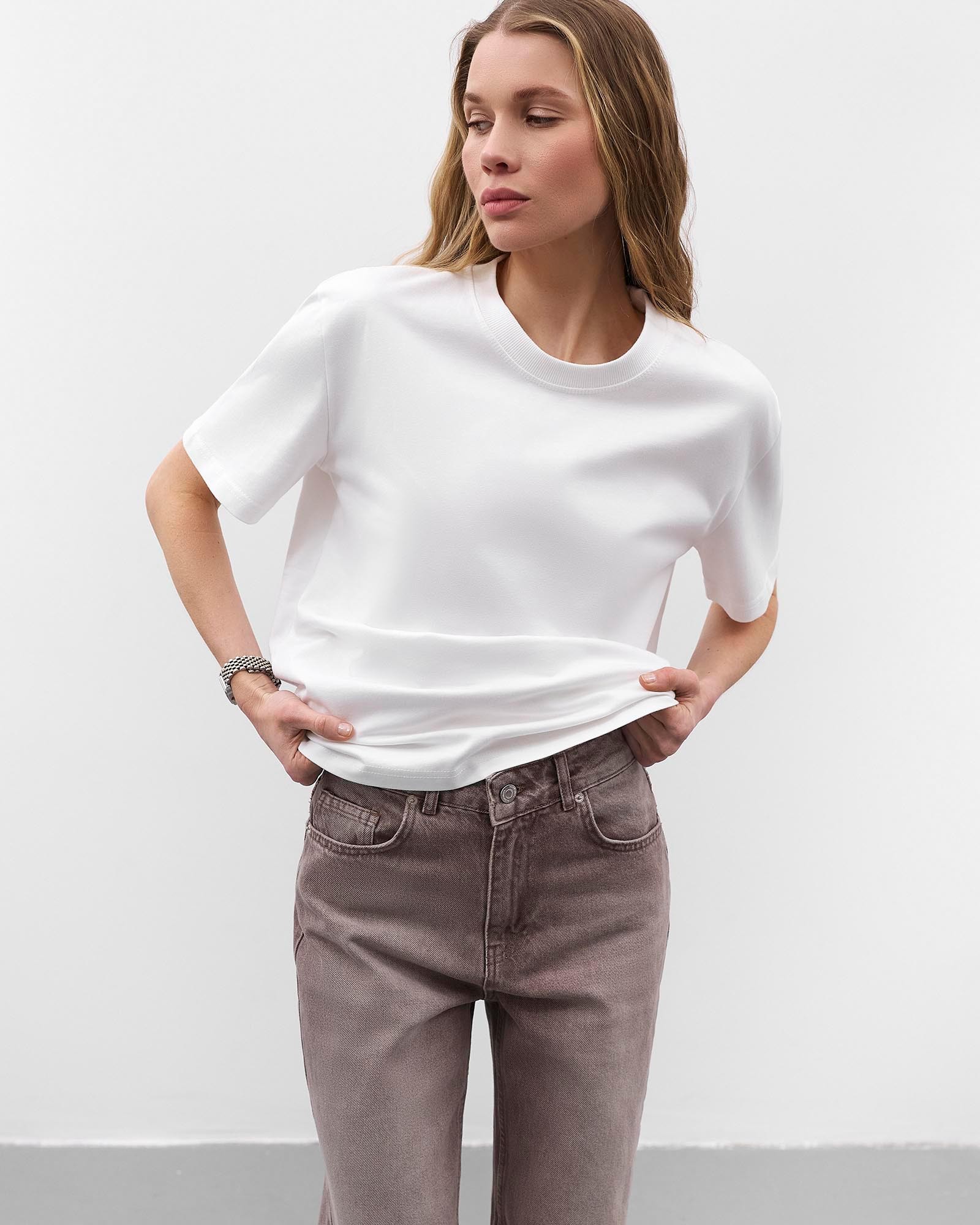 Однотонна футболка вільного крою з круглим вирізом. Модель з опущеними плечовими швами, подовженими рукавами та манжетами. На моделі розмір S.