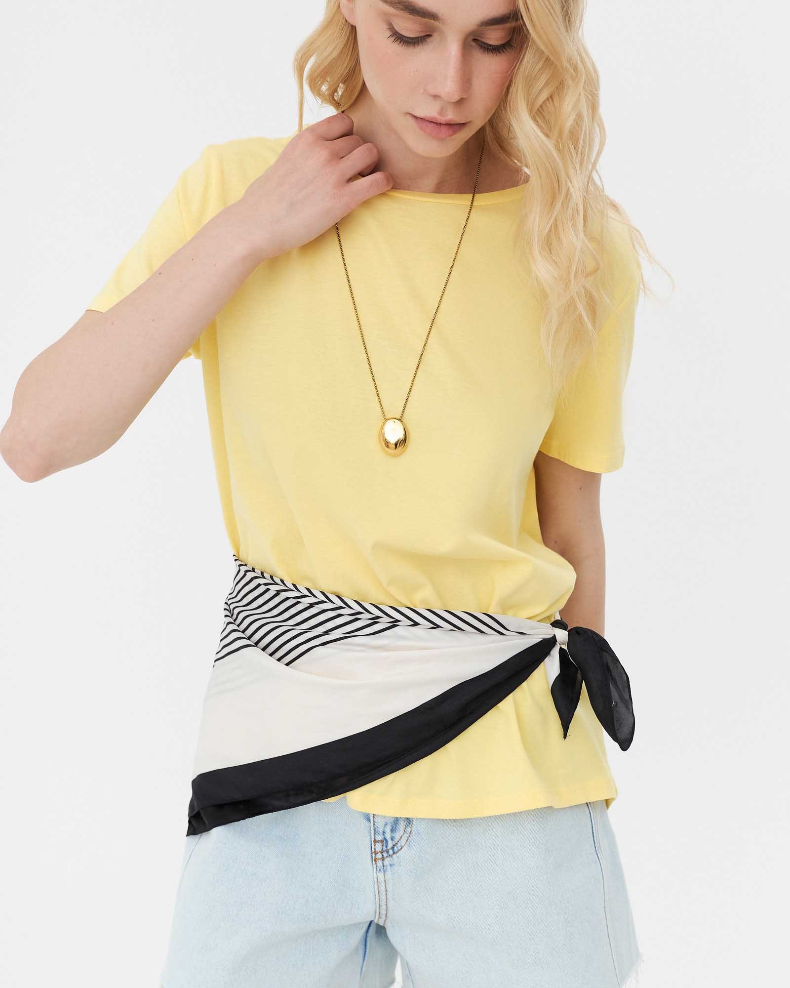 Однотонна футболка вільного крою з круглим вирізом та короткими рукавами. Модель з асиметричним низом, подовжена ззаду. На моделі розмір S.