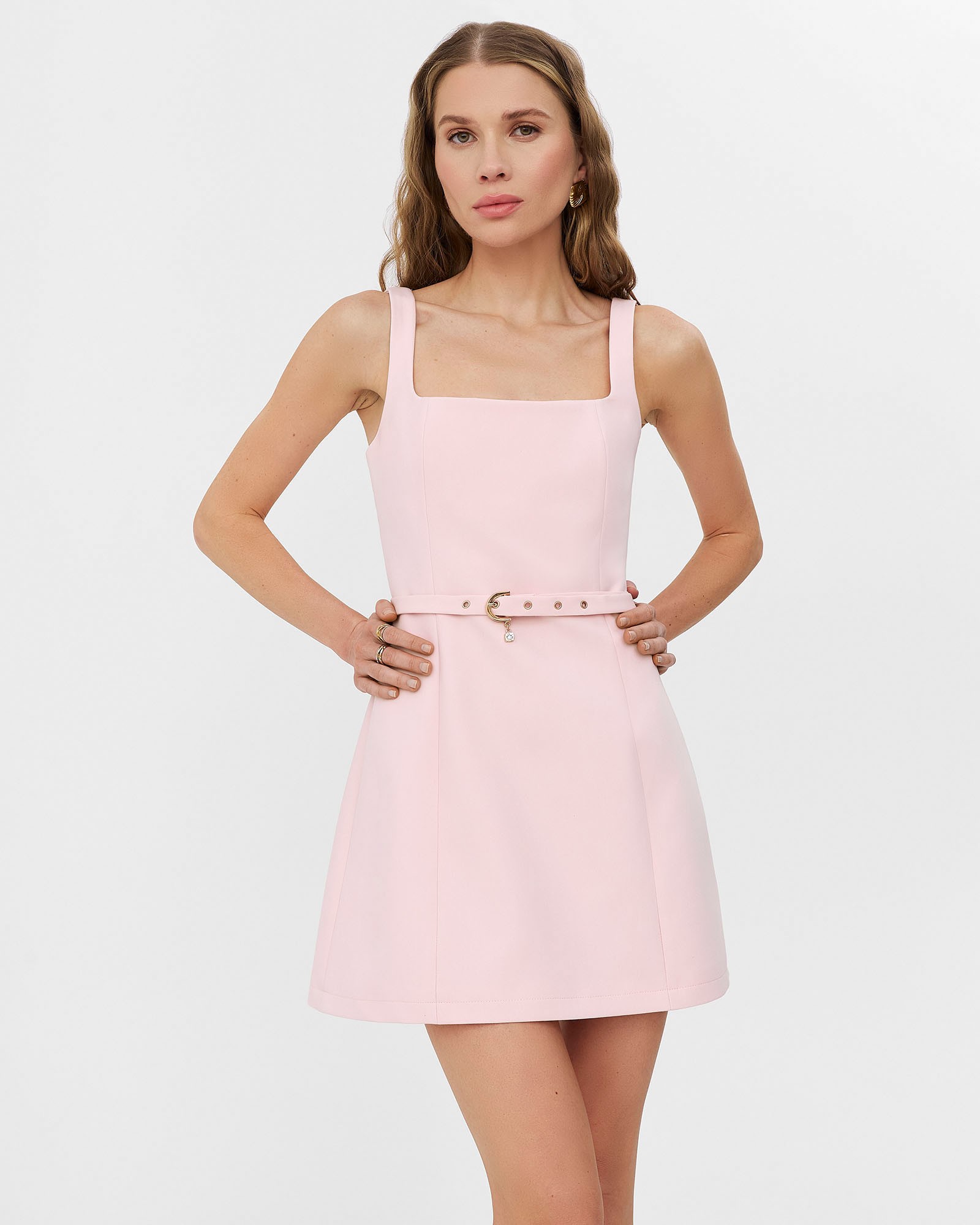 Однотонний сарафан довжини міні з поясом. Модель приталеного крою з широкими бретелями та прямокутним вирізом. Застібається на приховану блискавку...
