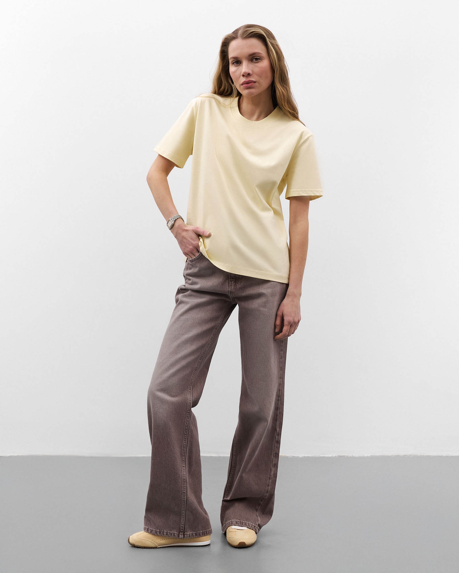 Однотонна футболка вільного крою з круглою горловиною, опущеними плечовими швами та короткими рукавами. На моделі розмір S.