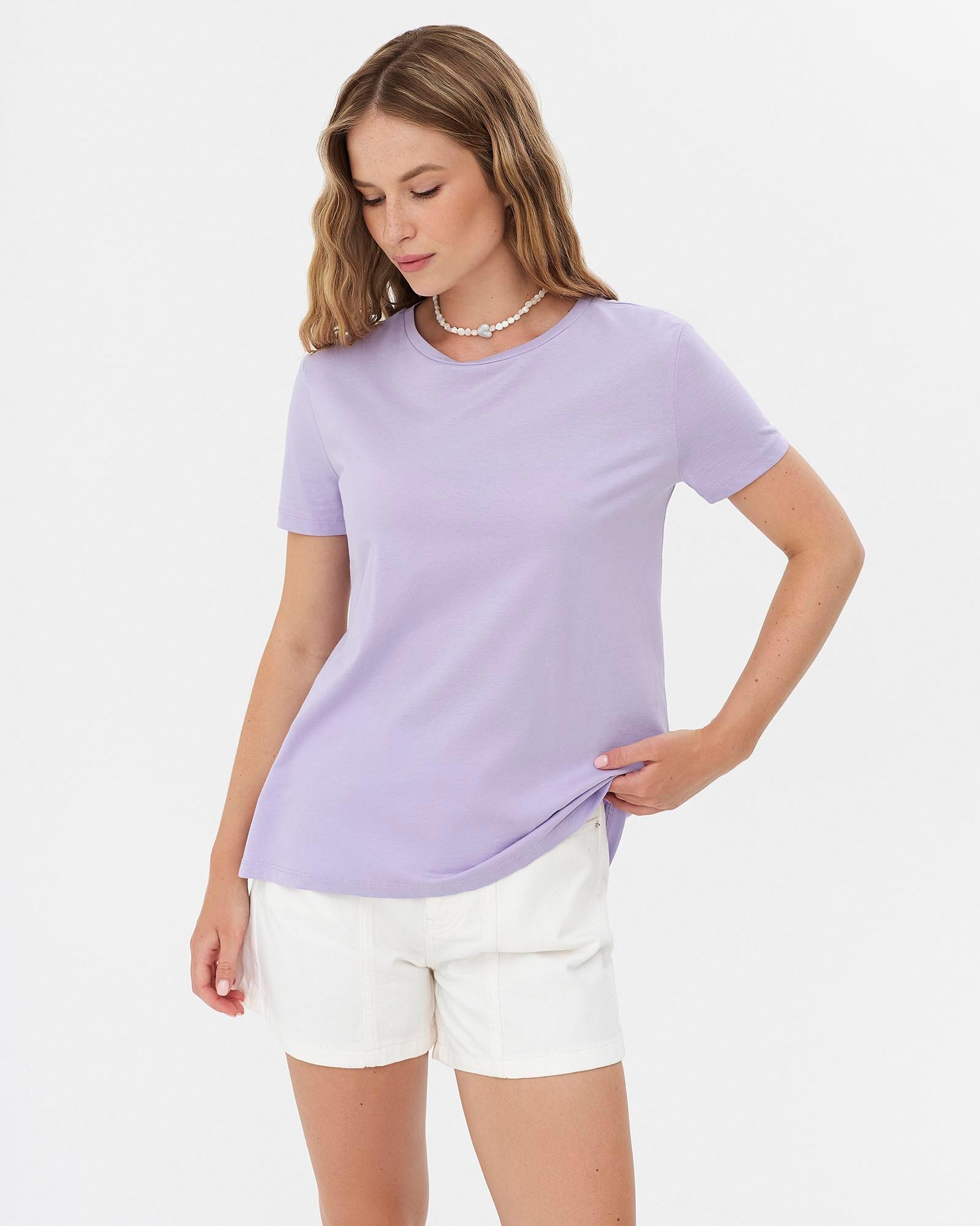 Однотонна футболка вільного крою з круглим вирізом та короткими рукавами. Модель з асиметричним низом, подовжена ззаду. На моделі розмір S.