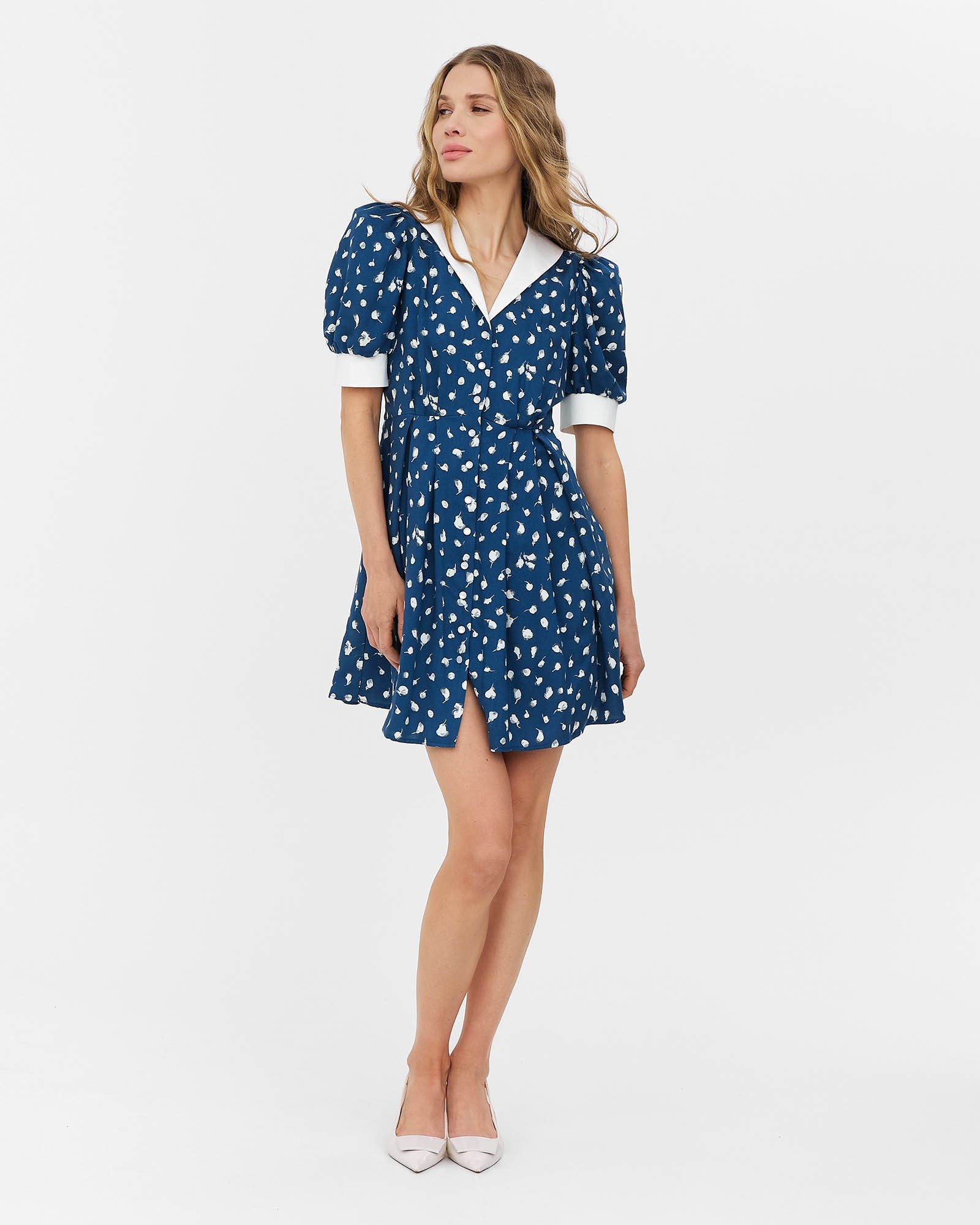 Принтована сукня-сорочка довжини міні з однотонним відкладним коміром і манжетами. Модель з короткими рукавами-воланами, складками та відрізною...