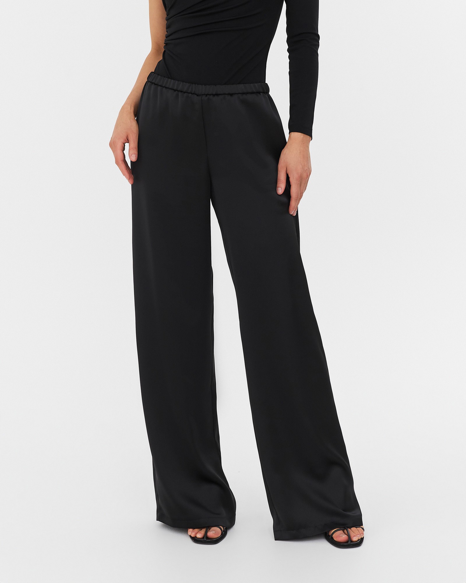 Однотонні сатинові штани вільного крою з високою посадкою. Модель з еластичним поясом та рівним обробленим низом. На моделі розмір S.