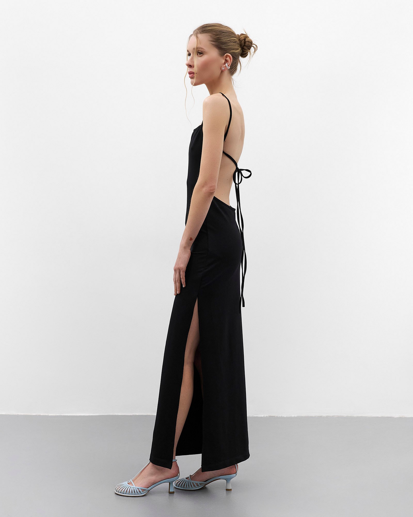 Довга однотонна трикотажна сукня з глибоким розрізом збоку. Облягаюча модель на тонких бретелях та шнурівкою на спині. На моделі розмір S.