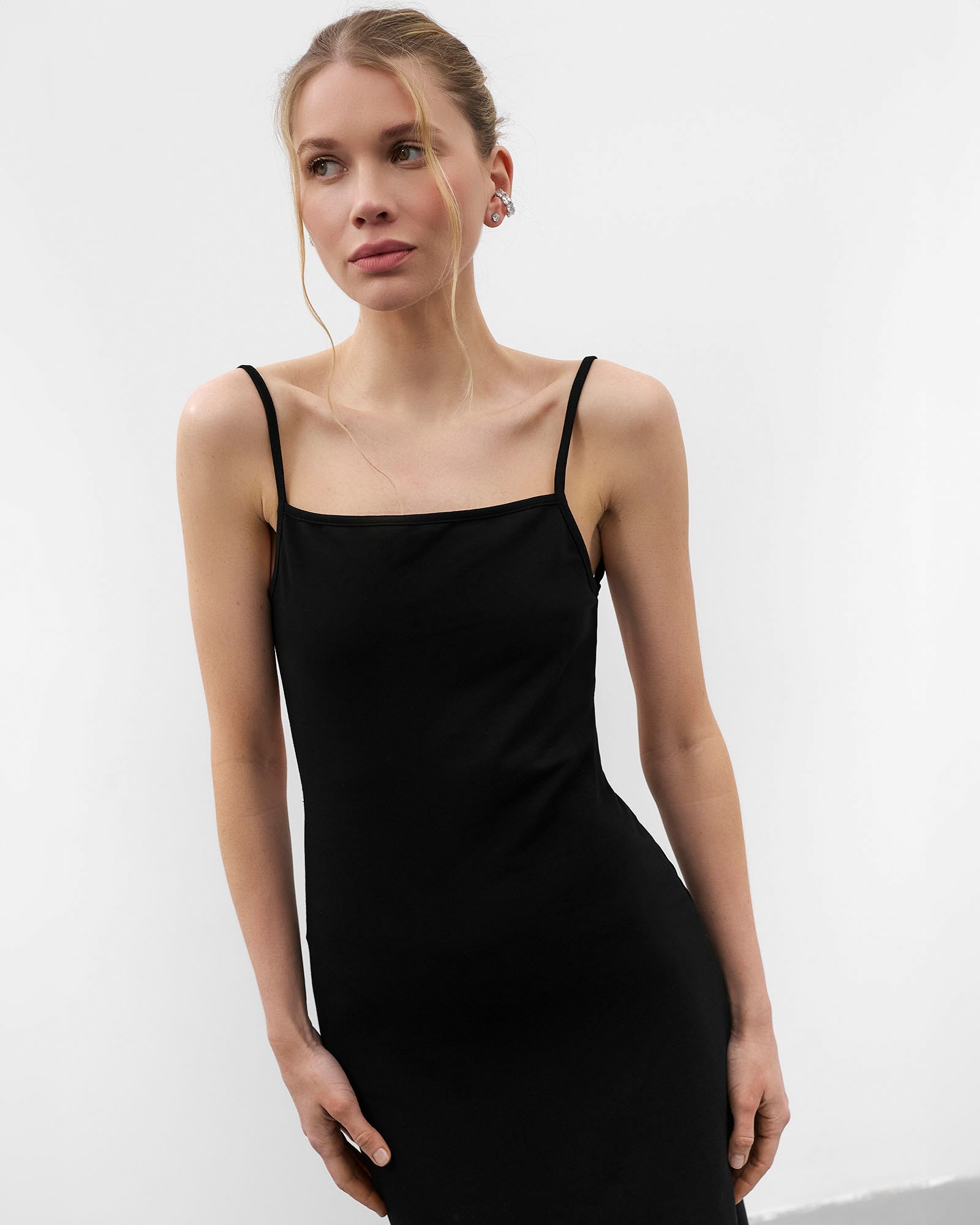 Зваблива сукня-комбінація довжини міді з глибоким розрізом спереду. Модель з тонкими бретелями, що регулюються та імітацією застібки на ґудзики з...