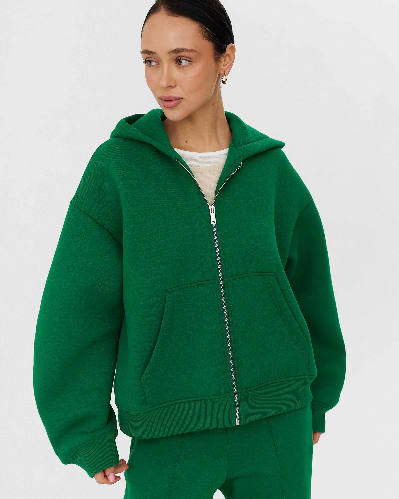 Однотонне худі із застібкою на блискавку та капюшоном. Модель з опущеними плечовими швами, довгими рукавами, накладними кишенями спереду та...