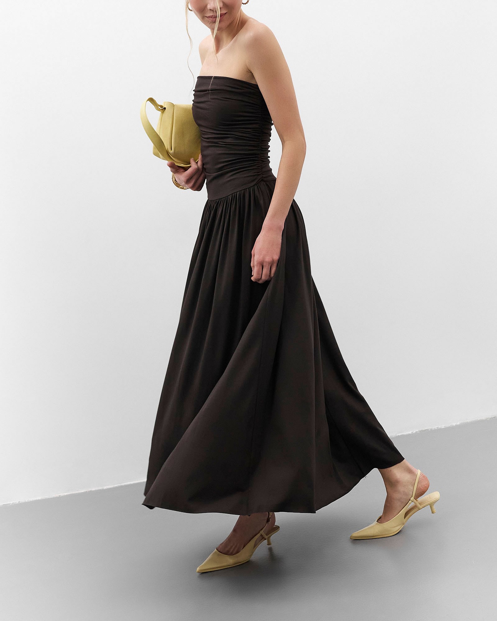 Однотонна трикотажна сукня довжини максі з відкритими плечима, драпіруванням на ліфі та відрізною спідницею зі збірками. На моделі розмір S.