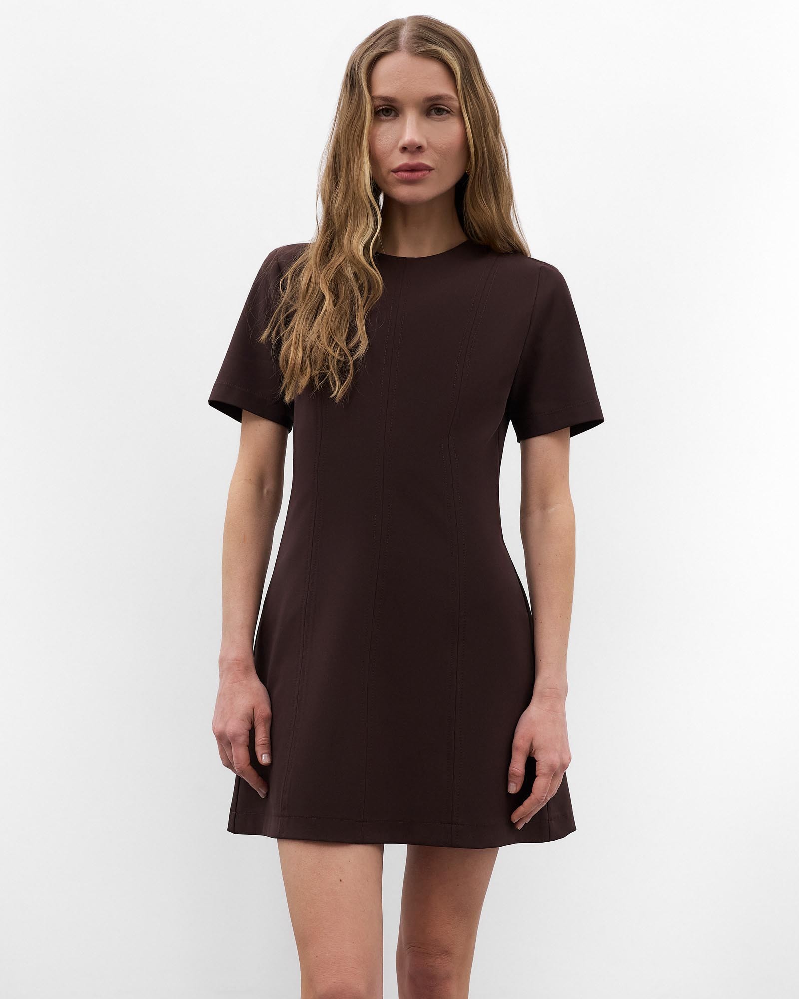Однотонна мінісукня приталеного крою з декоративними швами. Модель з круглою горловиною та короткими рукавами. Застібається на приховану блискавку...